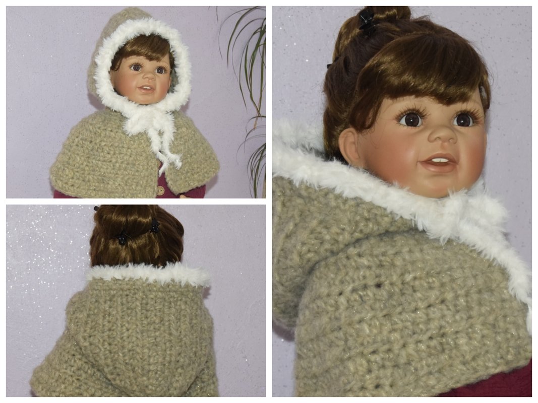 Das Model in rosa habe ich vor ein paar Jahren gemacht. Es ist vom Kapuzencape von Aschenbrödel inspiriert, deshalb ist die Kapuze Oversized, der Hals eng und das Cape sehr lang gearbeitet. Das graue Cape ist passend zum rosa Kleid mit weitem Rock weitschwingender gearbeitet. Der Pelzrand und die Knebelverschlüsse runden das ganze Design ab.