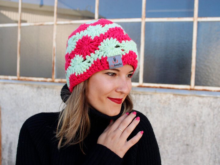 Die Mütze Saga überzeugt durch ihr Mageritenmuster im Sternenlook und die dadurch welligen Streifen der Kontrastfarben. Der Beanie ist eine willkommene Herausforderung für fortgeschrittene HäklerInnen