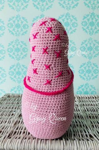 Die Anleitung beschreibt 3 verschiedene Größen: der Türstopper hat eine Höhe ca. 35 cm und einen Bauchumfang ca. 52 cm