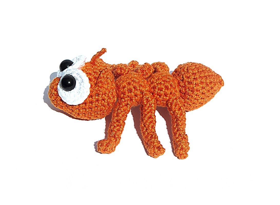 Die fertige Ameise wird ca. 10cm lang und 8cm breit. Natürlich kann die Größe variieren, je nachdem ob man fest oder locker häkelt. Auch die Wahl der Wolle ist entscheidend. Ich selbst häkle mit Apollo Baumwollgarn 125m/50g (100% Baumwolle).