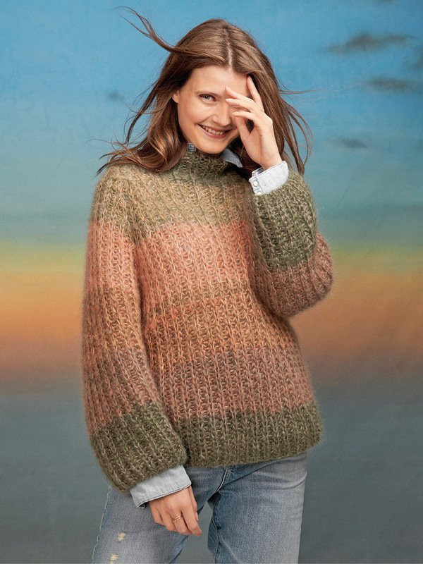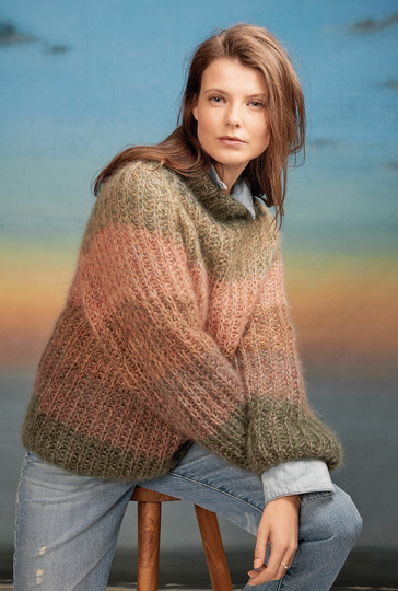 Durch den raffinierten Mix unterschiedlicher Farben entsteht die Streifenoptik des megaweichen Raglanpullis. Dreifädig verstrickt, indem immer wieder die Farben unterschiedlich gemischt werden, fungiert das feine Mohairgarn nicht nur als Wärmespender, sondern auch als Trendsetter in deiner Wintergarderobe. Das im Halbpatent gestrickte Muster geht eindeutig schneller als Vollpatent von der Hand und passt sehr gut zu diesem sportlich-lässigen Pulli. Rücken-, Vorderteil und Ärmel sind bis zum Raglanbeginn einzeln gestrickt und werden dann auf einer Rundstricknadel in Runden weitergearbeitet. Die Anleitung gibt es für die Größen 36/38, 40/42 und 44/46.