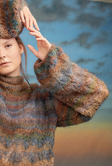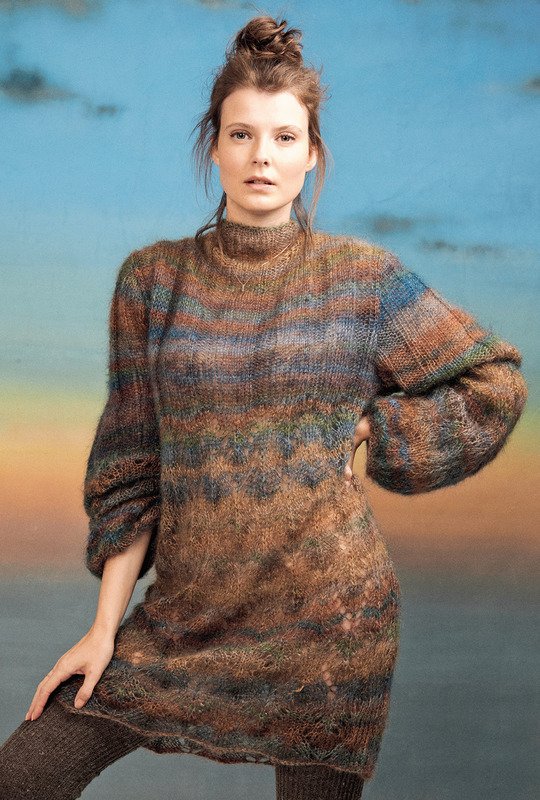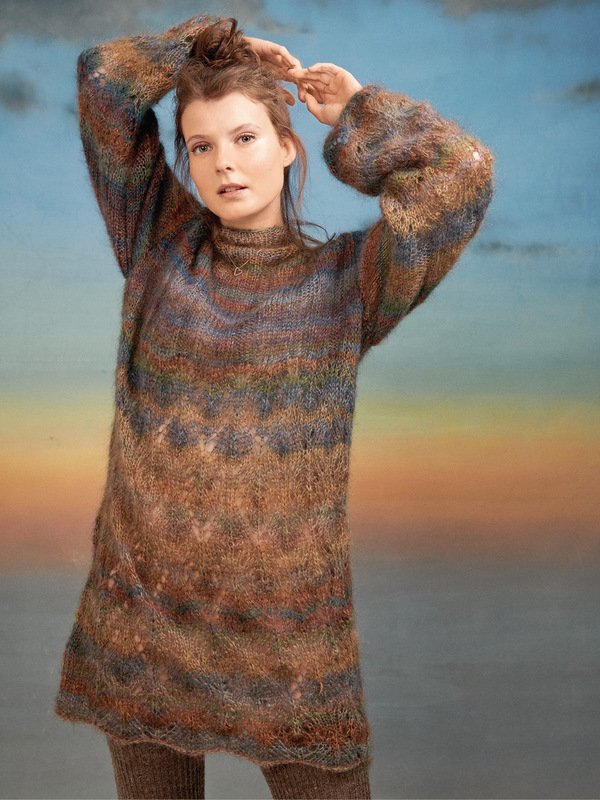 Farbverlaufsgarne haben in dieser Saison Bestseller-Potential. Besonders dann, wenn die Nuancen so harmonisch aufeinander abgestimmt sind wie bei diesem Minikleid, das durch das Blattmuster, breite Rippen und die modischen Keulenärmel begeistert. Das Kleid ist federleicht und wiegt nur 250 bzw. 350 g (je nach Größe) durch den feinen Mohairflausch. Im unteren Bereich wird ein Ajoumuster im oberen werden breite 6/6-Rippen gestrickt. Eine Anleitung steht für die Größen 38/40 und 46/48 zur Verfügung – federleicht durchfeinen Mohairflausch.