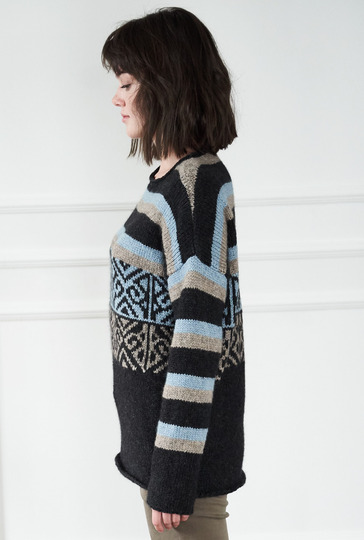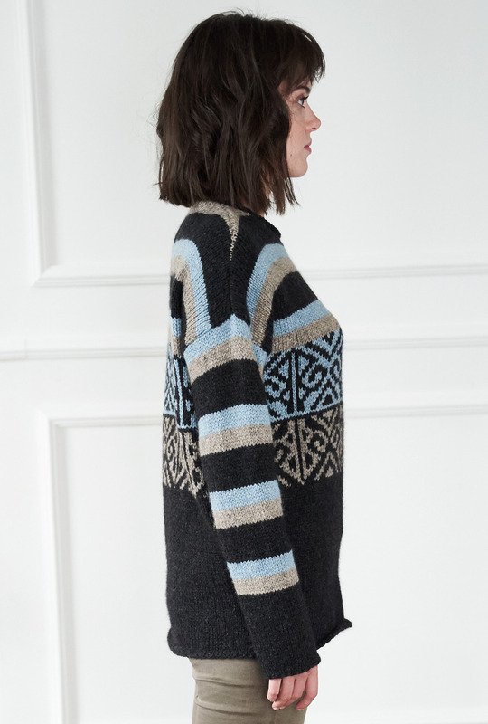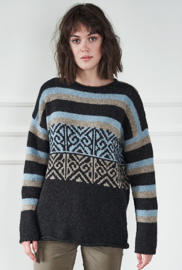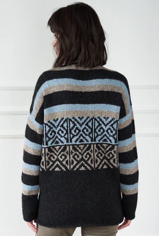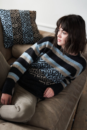 Herrlich gemütlich: Pulli aus hochwertiger Alpakawolle. Dazu darf natürlich das passende Kissen nicht fehlen – so wird es dann richtig kuschelig! Damit aber auch die Spannung nicht zu kurz kommt, bringen Streifen und graphische Muster in Jacquardtechnik noch jede Menge Abwechslung ins Spiel. Gestrickt wird der Pulli in vier Teilen und von unten nach oben. Wir beginnen dabei mit dem Rippenbündchen, stricken dann ein Stückchen glatt rechts, gefolgt von dem Jacquardmuster. Dieses wirkt durch die raffinierte Spiegelung ganz besonders gut. Durch das anschmiegsame, elastische Garn gleiten die Maschen auch im Mehrfarbmuster leicht und angenehm über die Nadeln und da die einzelnen Farbflächen nicht über viele Maschen gehen, braucht auf der Rückseite der jeweils mitlaufende Faden auch nicht verkreuzt werden. Die übersichtliche und farbige Strickschrift erleichtert das Musterstricken noch zusätzlich. Zur Erholung geht es im Anschluss dann mit dem Streifenmuster weiter bis zum Ende. Die Ärmel werden nach dem Rippenbündchen ausschließlich in der Streifenfolge gearbeitet. Sind alle viert Teile fertig, werden noch die Nähte geschlossen und aus dem Halsausschnitt die Maschen für die Blende herausgestrickt.