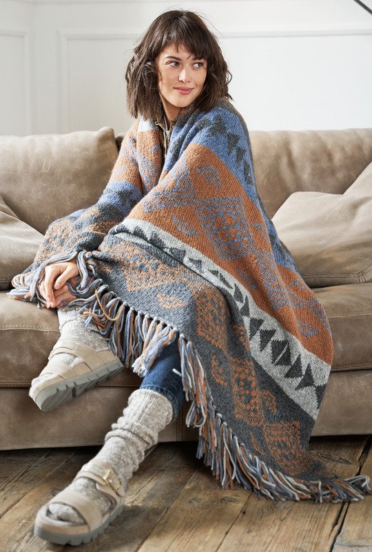 Zum Umlegen, Zudecken oder einfach als dekorativer Eyecatcher dient das Plaid, bei dem verschiedene Jacquardmuster zum Einsatz kommen. Hübsche Randerscheinung: die eingeknüpften Fransen. Zugegeben, etwas Geduld benötigt die Decke schon, jedoch lässt sich das weiche Garn sehr angenehm verarbeiten und die unterschiedlichen Jacquardmuster und harmonischen Farben bieten viel Strickfreude. Gestrickt wird die Decke all over in zwei Norwegermustern, die sich stets abwechseln. Da die Muster teils längere Farbabschnitte beinhalten, sollten unbedingt alle 4 bis 5 Maschen der jeweils auf der Rückseite mitlaufende Faden mit dem Arbeitsfaden verkreuzt werden. So werden zu lange Spannfäden auf der Rückseite vermieden. Ist alles fertig gestrickt, wird die Decke noch mit einer runde fester Maschen und einer Runde Kettmaschen umhäkelt. In den Anschlag- und Abkettrand werden dann die Fransen eingeknüpft.