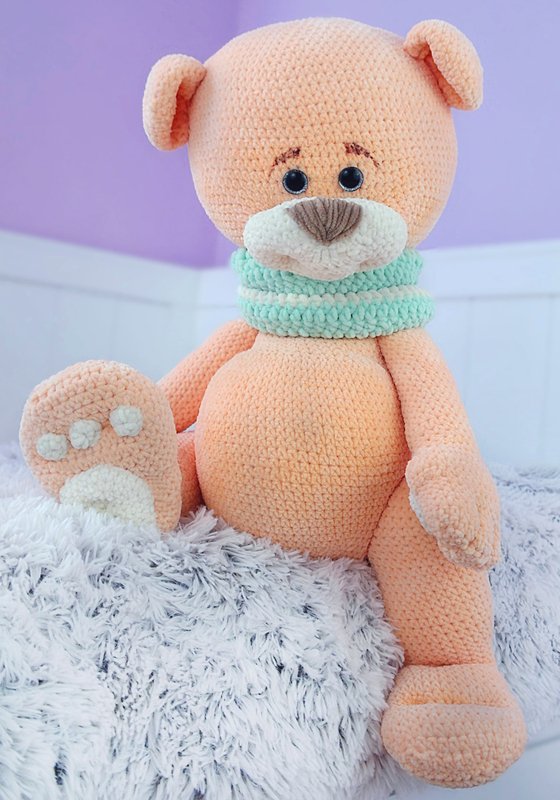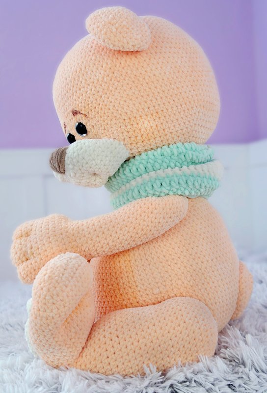 Der große Bär Pfirsich ist nach derselben Anleitung nur mit einer dickeren Plüschwolle gehäkelt Man häkelt ihn links gegen den Uhrzeigersinn. Größe: sitzend -50cm, stehend- 65 cm.