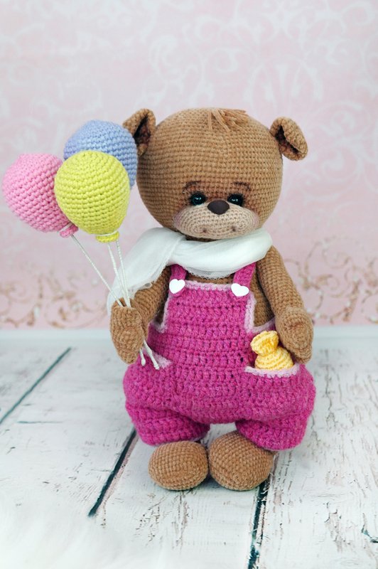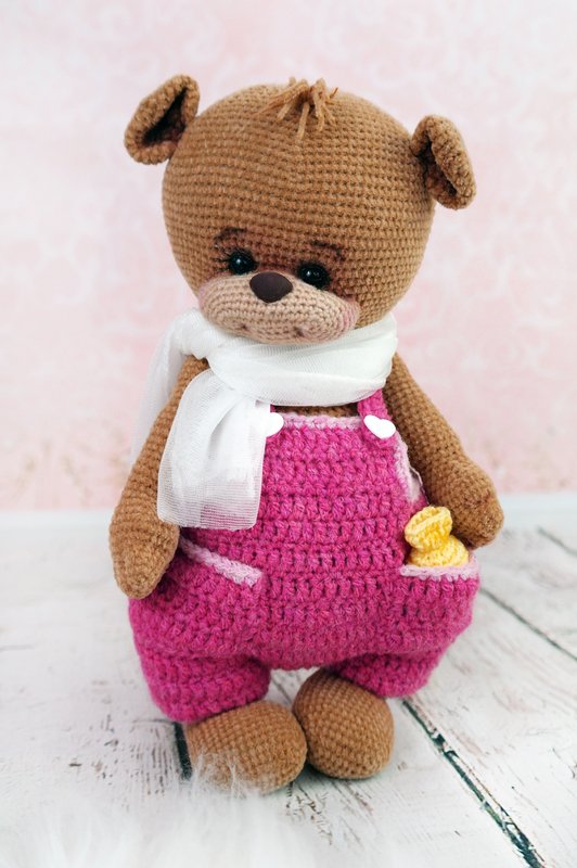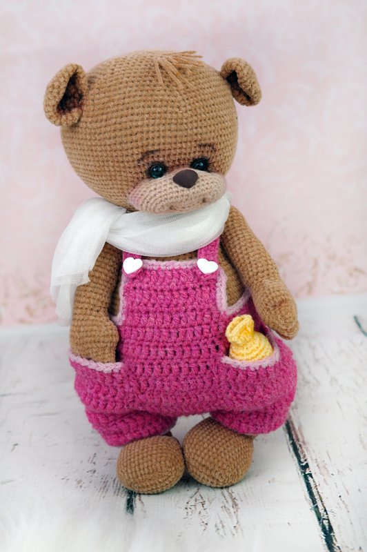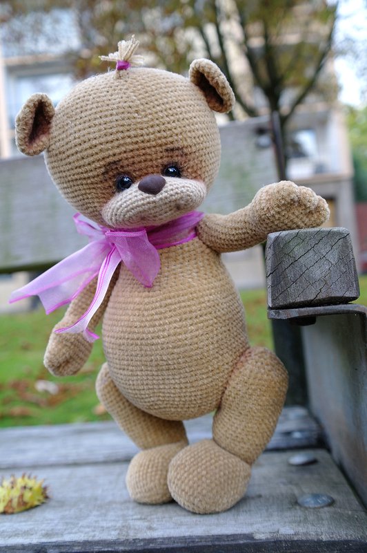 Der kleine Bär Lucy ist aus dünner Chenille Wolle gehäkelt. Größe: sitzend -20 cm, stehend- 25 cm.