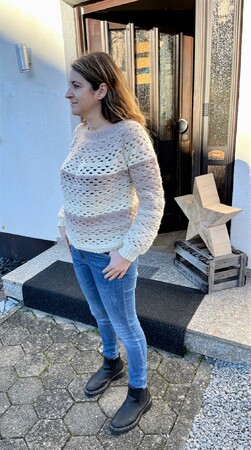 Der Anfang ist für alle Größen gleich. Vergrößert wird der Pullover durch das Häkeln von zusätzlichen Reihen. Meine Testerinnen und ich haben von Babygröße 56 bis Erwachsenengröße 46 gehäkelt. Wie der Pullover/das Shirt weiter vergrößert werden kann, wird in der Anleitung beschrieben.