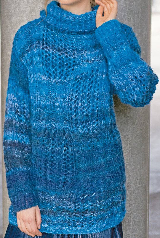 Blautöne kommen jetzt ganz groß raus. Besonders, wenn sie aus edler Garnmischung aus Schurwolle, Alpaka und Seide dreifädig gestrickt werden und sich Loch- und Zopfmusterquadrate zu einem Pulli vereinen, in dem du Tag und Nacht eine gute Figur machst. Der Pullover ist extralang und passt genauso gut über einen Rock als auch über eine Hose. Der üppige Rollkragen aus Rippen mit rechts verschränkten und linken Maschen legt sich weich um den Hals. Die Anleitung dazu gibt es für die Größen 38/40 und 44/46.