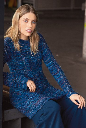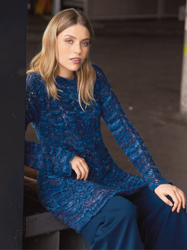 Der besondere Charme dieses Zopf-Ajourpullis liegt nicht nur in der bequemen Tunikaform, sondern auch im Garn: Der Melange-Effekt wird mit schimmerndem Lurexglanz noch eindrucksvoller. Nach einer schonenden Handwäsche den Pullover unbedingt in der ursprünglichen Länge auslegen, damit er sich nicht in die Länge zieht. Die Ärmel enden mit einer Schulterpasse, der Halsausschnitt ist mit festen Maschen und Krebsmaschen umhäkelt. Der Schnitt der Tunika macht eine gute Figur und verdeckt auch gekonnt Pölsterchen um die Hüften. Die Anleitung kannst du in den Größen 36/38 und 48/50 herunterladen.