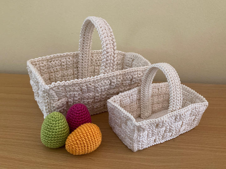 Das Ostertrio ist ganz schnell gehäkelt. Das Körbchen ist anfangs etwas friemelig, aber wenn man den Dreh erst einmal raus hat, dann geht es schnell von der Hand.