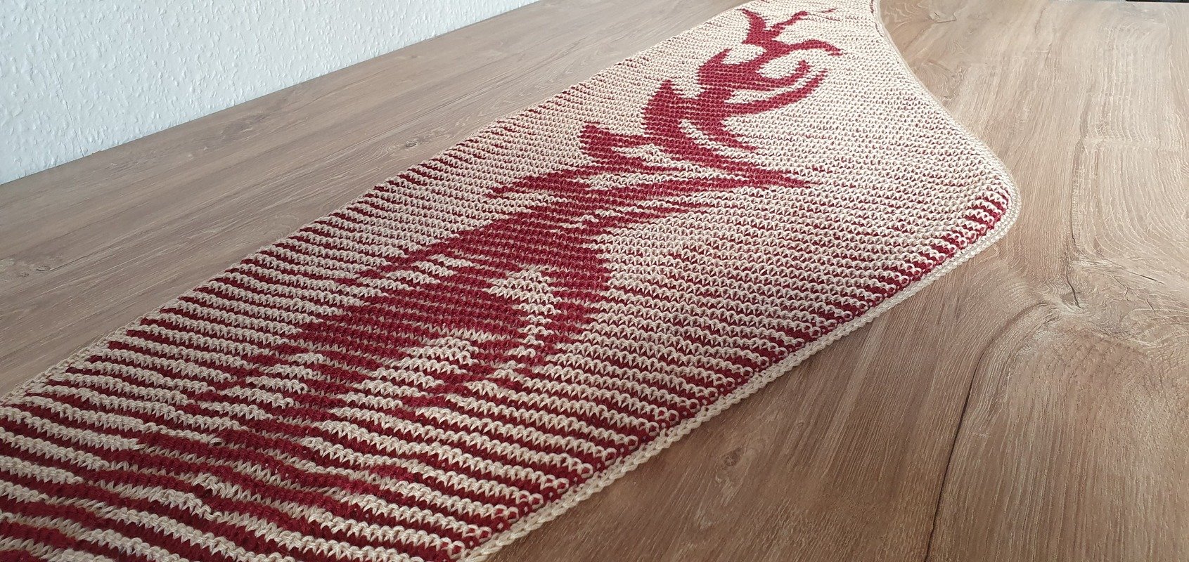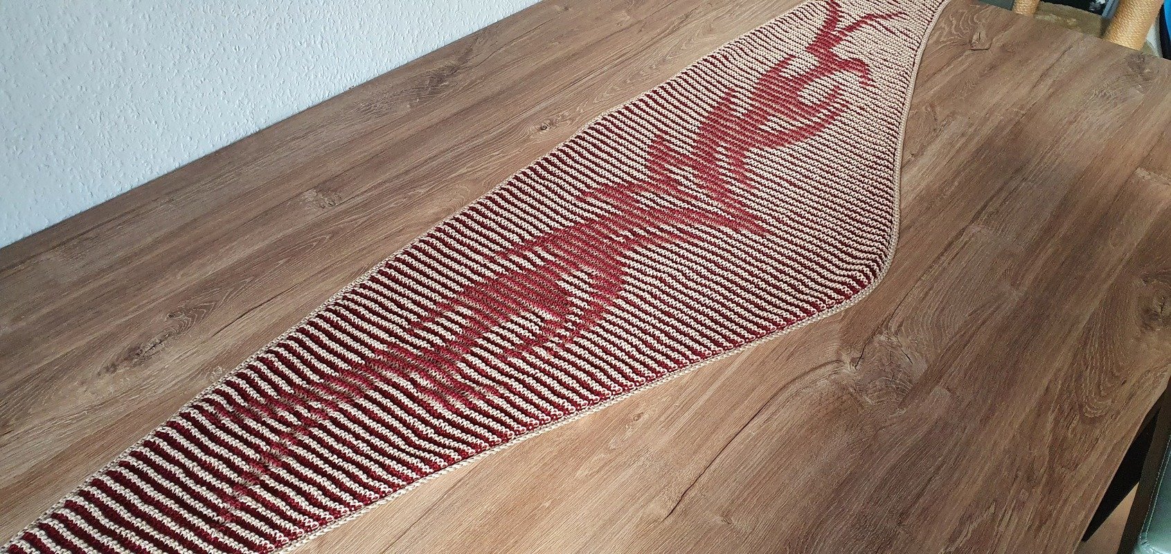 Das fertige Tuch hat bei mir eine Größe von etwa 200cm (Spannweite) x 39 cm (Tiefe).