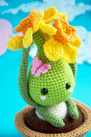 Garn: DK, light worsted, Nr. 3 Garn, in den Farben: Dunkelgrün, Hellgrün, Cremeweiß, Gelb, Orange, Dunkelbraun, Hellbraun. Rosa and Lila Sport Baby Garn für Wangen und Schmetterling.