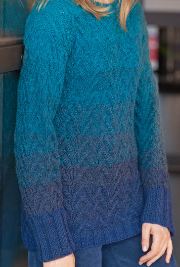 Unten dunkel, oben hell und das alles mit einem Garn! So entsteht ein Pulli, dessen markantes Flechtmuster dem türkis-violetten Farbverlauf jede Menge Dynamik verleihen und so das marine Flair betonen. Das allover verzopfte Flechtmuster ist genau das Richtige für passionierte StrickerInnen. Ein weiter runder Halsausschnitt schmeichelt dem Dekolletté, die nach oben hin breit werdenden Ärmel bieten viel Komfort. Alle Bündchen sind in einem breiten Rippenmuster aus abwechselnd drei rechten, drei linken Maschen gestrickt. Die Anleitung gibt es für die Größen 36/38 und 40/42.