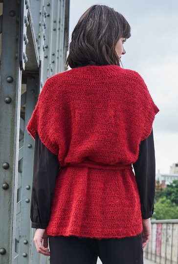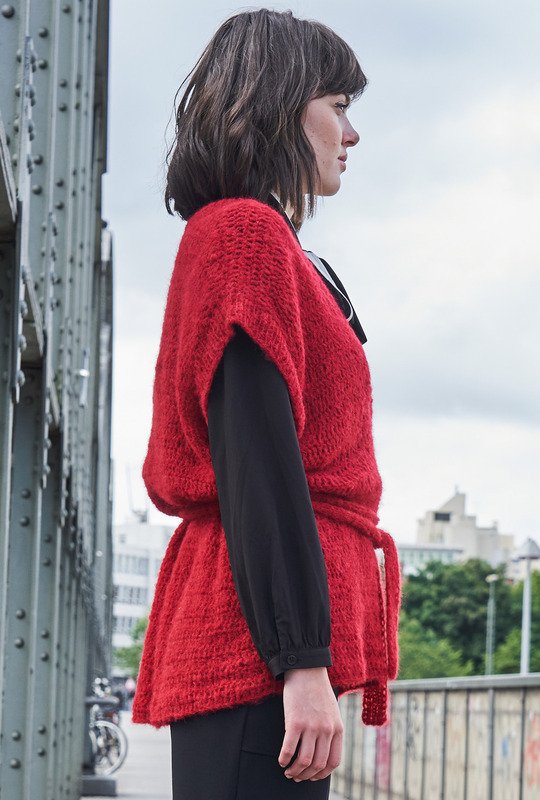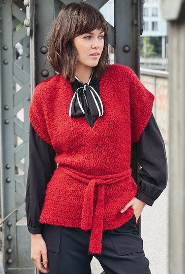 Ein bisschen retro und wunderbar zum Kombinieren ist dieser Pullunder, bei dem Häkeln und Stricken effektvoll miteinander vereint wurden. Ob mit oder ohne Gürtel – ein echtes Statement in Knallrot! Gehäkelt wird ein Einzelteilen von unten nach oben. Nach dem Anschlag geht es mit Stäbchen und Häkelnadel Nummer 5 zügig voran. Sind Rücken- und Vorderteil fertig gehäkelt, geht es auch schon an die Strickdetails. Dafür werden die Nähte geschlossen und die Blenden des Halsausschnitts sowie der Armausschnitte im Rippenmuster gestrickt. Dann noch den langen Bindegürtel und fertig ist der wandelbare Slip-Over.