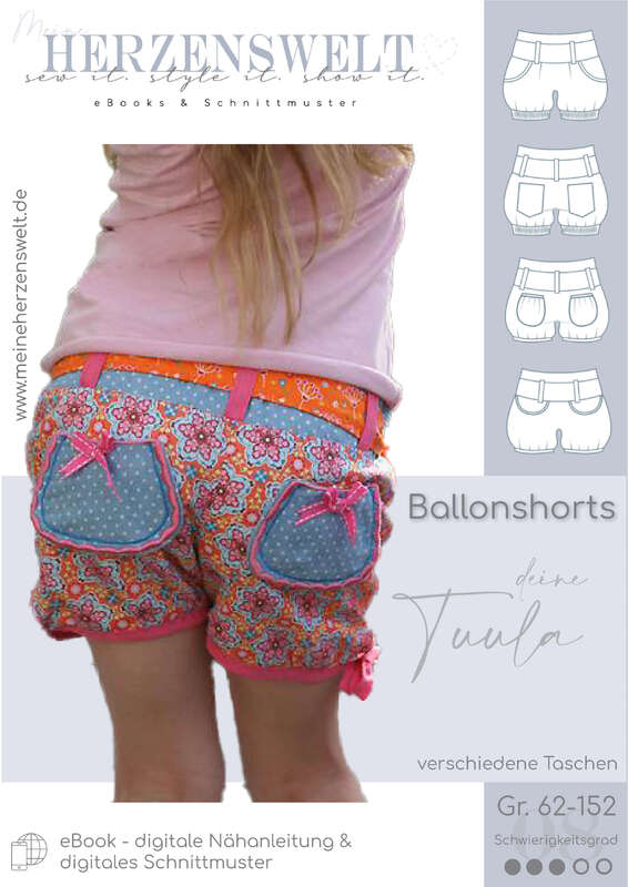 Das eBook beinhaltet ein Schnittmuster mit den Größen 62-152. Für diese Shorts benötigst du schöne Baumwollstoffe (oder Alternativen) und noch weiteres Material zum Verzieren.