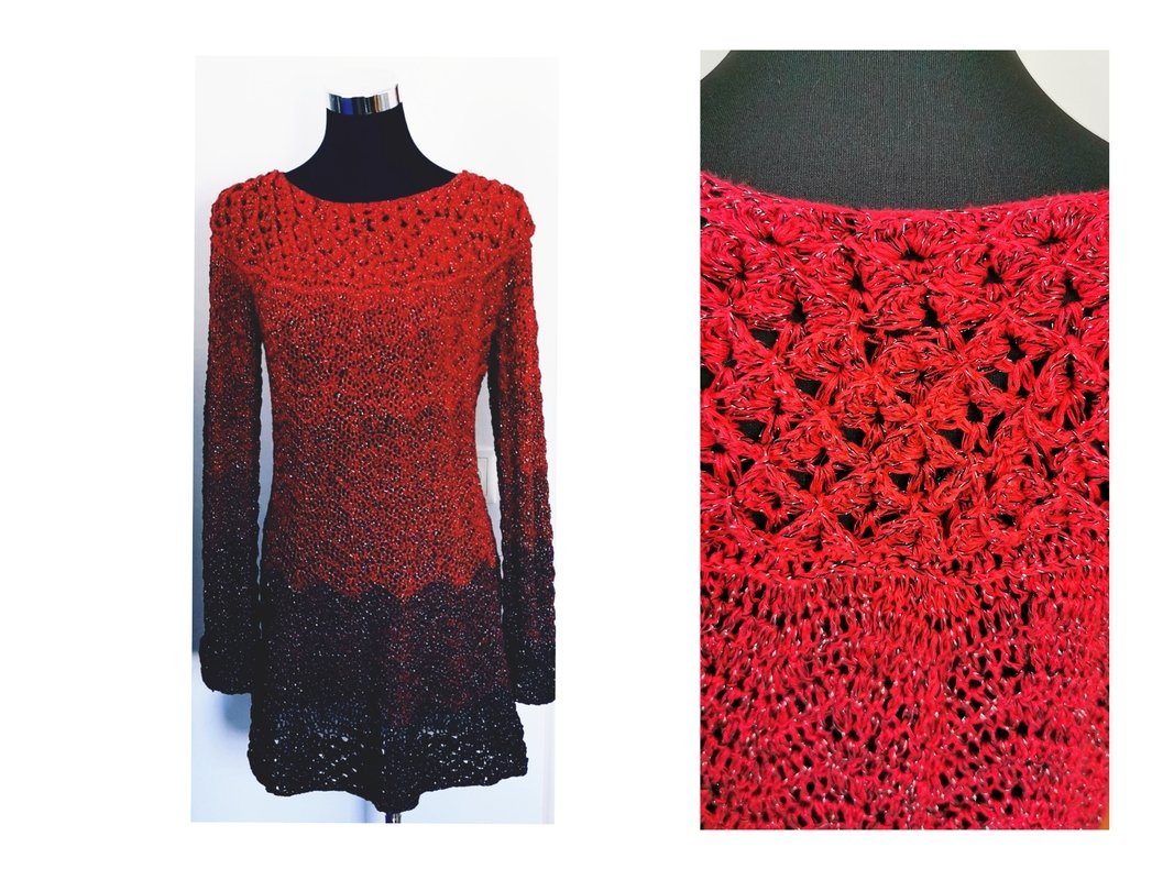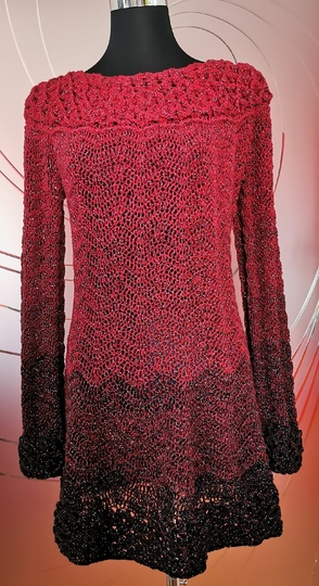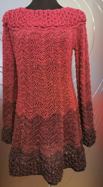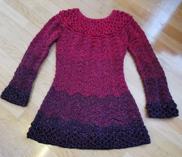 Karfunkel ist ein eleganter Pulli oder auch ein elegantes Minikleid, dessen Glitzereffekt durch das 3D-Muster und das Wellenmuster noch verstärkt wird.