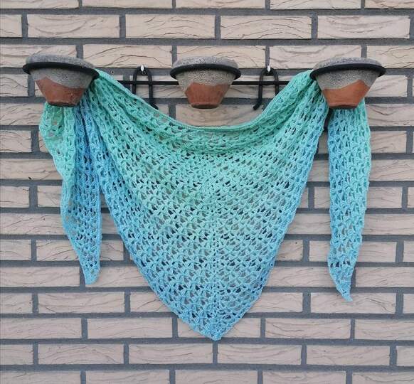 SABA gibt es in 2 unterschiedlichen Formen: einmal als klassisches Dreiecktuch oder als V-Tuch. Der Unterschied liegt darin, dass man im Grunde nicht mit Reihe 1 eines Dreiecktuches beginnt, sondern einige Reihen später. Deshalb wird mit einer Luftmaschenkette oder mit einem Fußschlingenanschlag (empfohlen) angefangen. Dadurch kann sich die Anschlagsreihe um den Hals legen und man hat nicht ganz so viel Tuch im Ausschnitt, wenn man das Tuch wie einen Schal unter einer Jacke trägt. Wen das immer schon gestört hat, sollte es mit einem V-Tuch versuchen. Wenn Du Dir die Titelbilder der beiden Tücher im Vergleich ansiehst, kannst Du den Unterschied gut erkennen. Natürlich lässt sich auch das V-Tuch um die Schultern legen, wenn es abends etwas kühler wird.