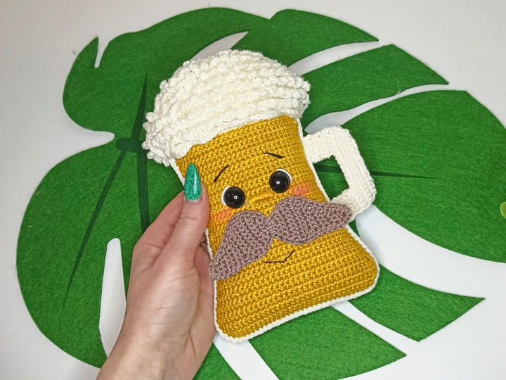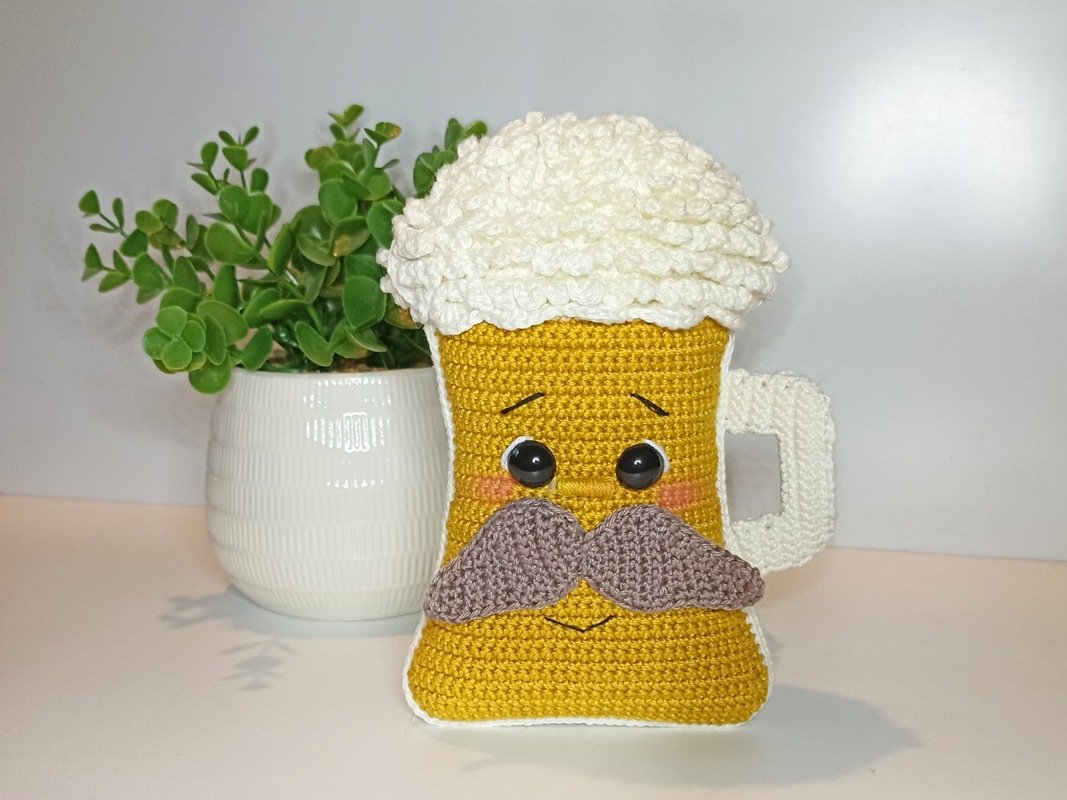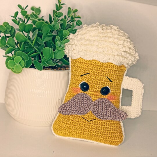 Mit angegebenem Garn wird Bernd ca. 18 cm hoch, mit Chenillegarnen, wie zum Beispiel Myboshi Samt wird Bernd zum stattlichen Kuschelkissen.