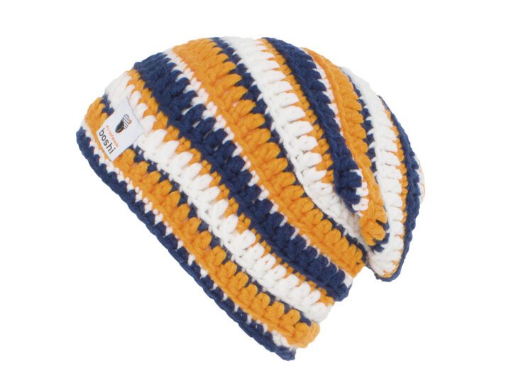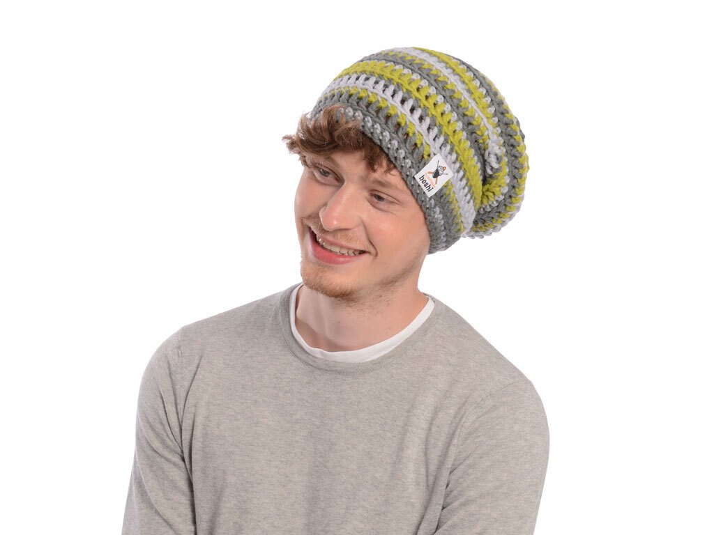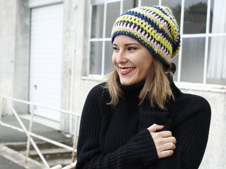 Die Mütze Hirakawa überzeugt durch ihre farbenfrohen Ringeln, die durch unterschiedliche Maschenarten eine unterschiedliche Höhe bekommen. Der lässige Longbeanie ist dennoch einfach zu häkeln und alle Maschenarten werden bebildert in der Anleitung erklärt.