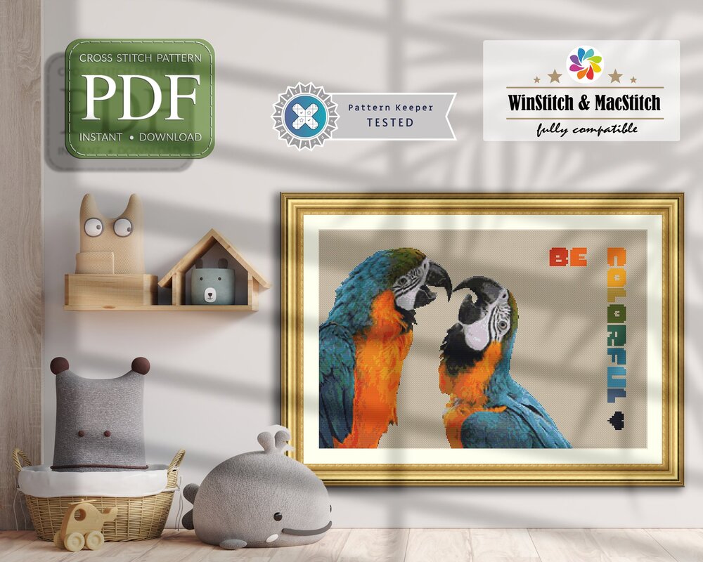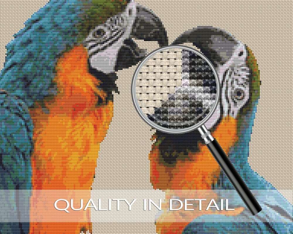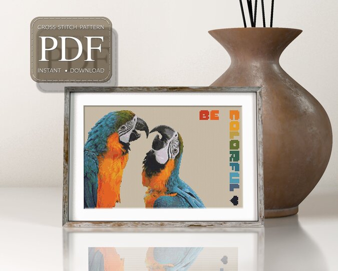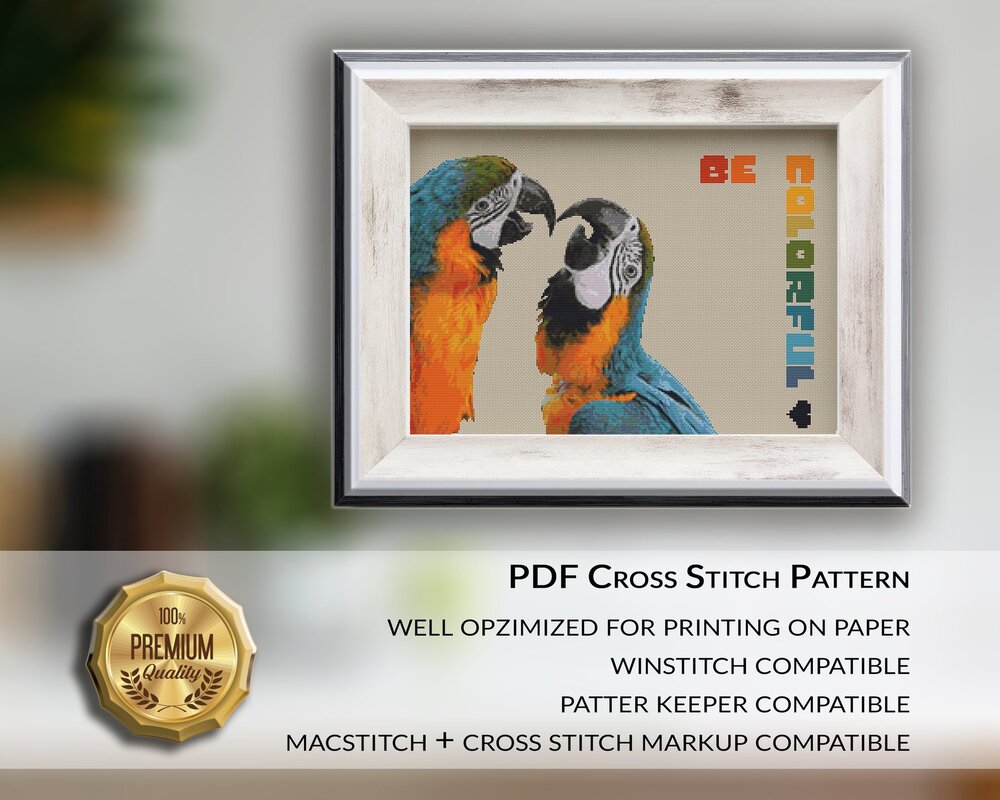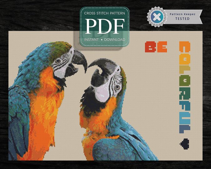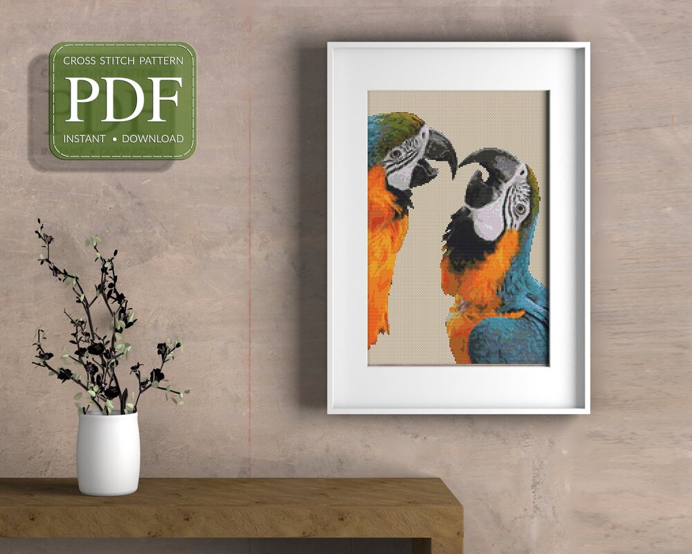 A cross stitch pattern with two kissing parrots - lots of meaning and lots of colors. Think carefully for whom the motif is suitable. This includes not only bird lovers and nature lovers ;-)