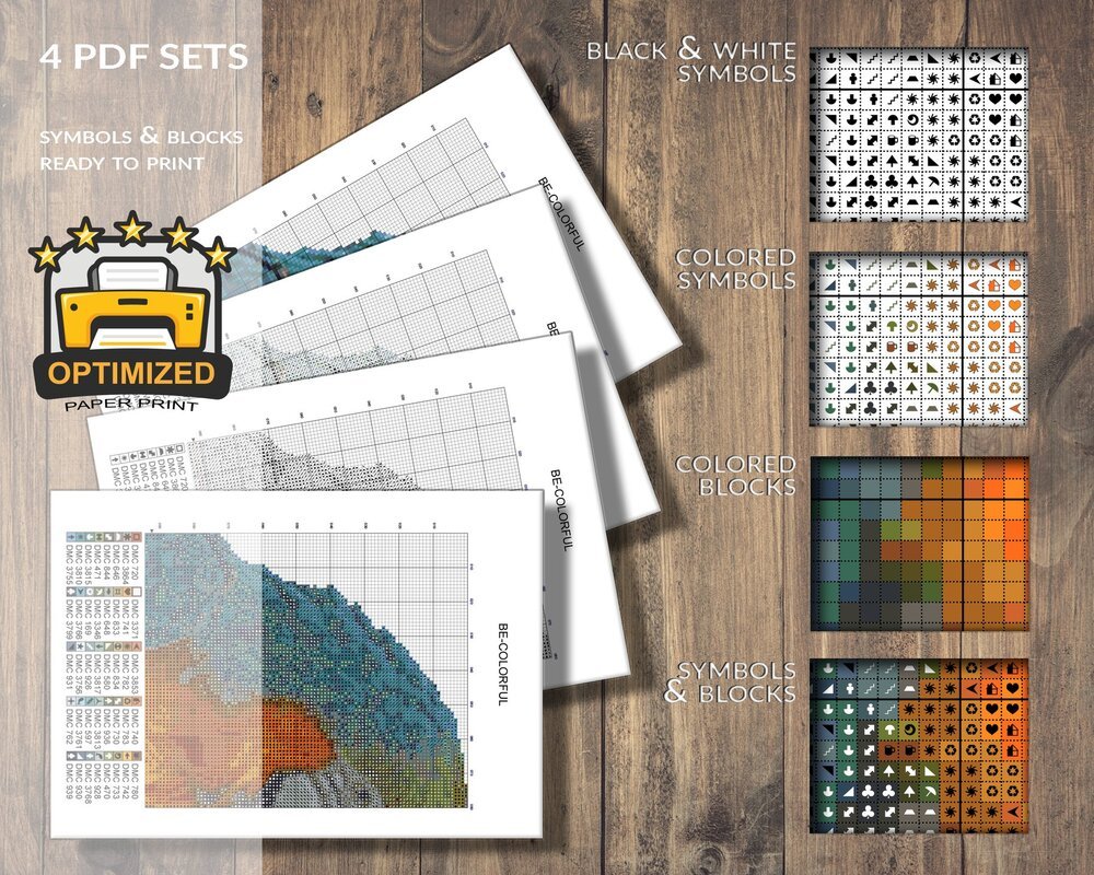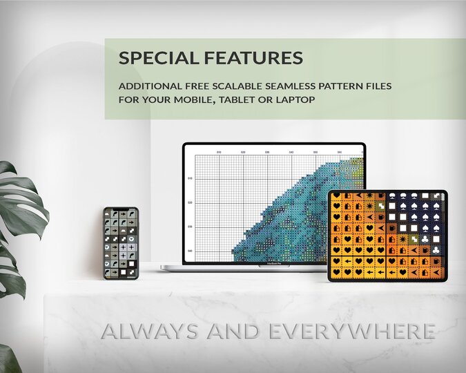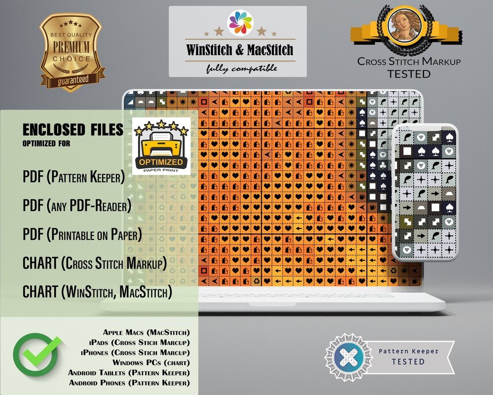 You will receive the cross stitch pattern as PDF files, available for instant download. The digital files are optimized for printing an paper or fore use on the screens of tablets, mobile phones or laptops (well tested for Pattern Keeper, WinStitch, etc.). You can buy these files right here and download them immediately.