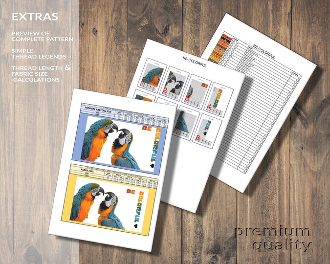 You get ready-made cross stitch patterns and calculations of thread lengths and fabric sizes for 12ct, 14ct, 16ct and 20ct: