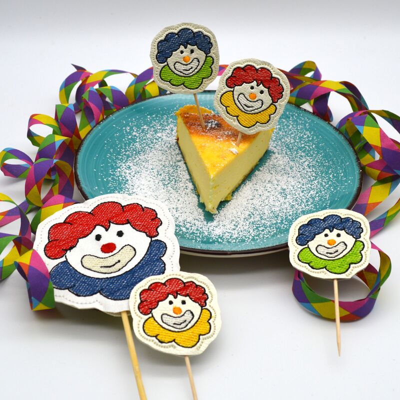 Süße Clowns als Deko zur Faschingszeit oder Geburtstag! Gestickt werden sie als kleine Stabstickdateien, das heißt, sie können auf einen Holzspieß aufgespießt und als Deko auf Muffin, Kuchen, Mohrenköpfe verwendet werden!