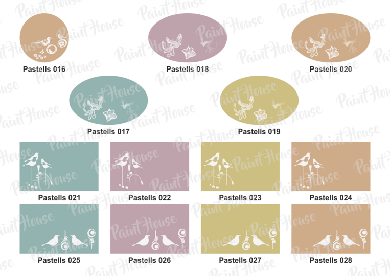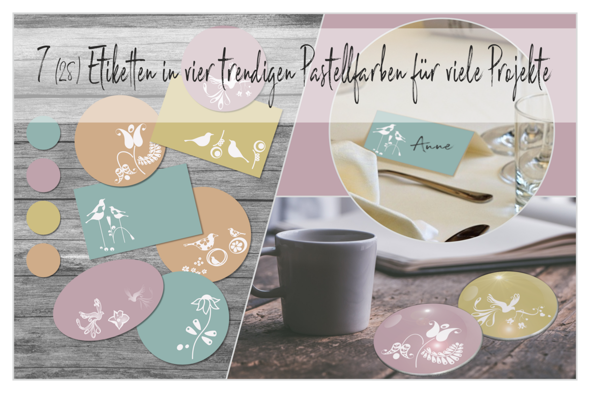7 Zauberhafte Motive in je 4 trendigen Pastellfarben für verspielte Kärtchen zum Aufhübschen von Geschenkverpackungen, für Scrapbooking, Bastelprojekte oder Gruß- und Tischkarten und vieles mehr.