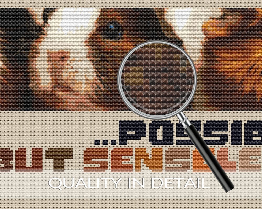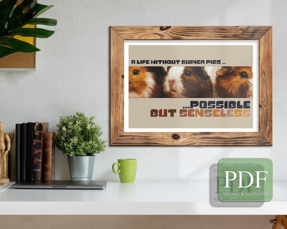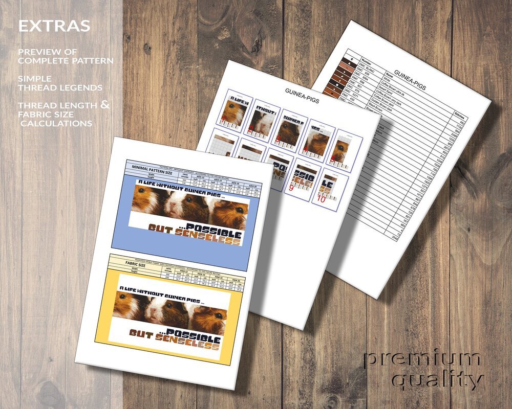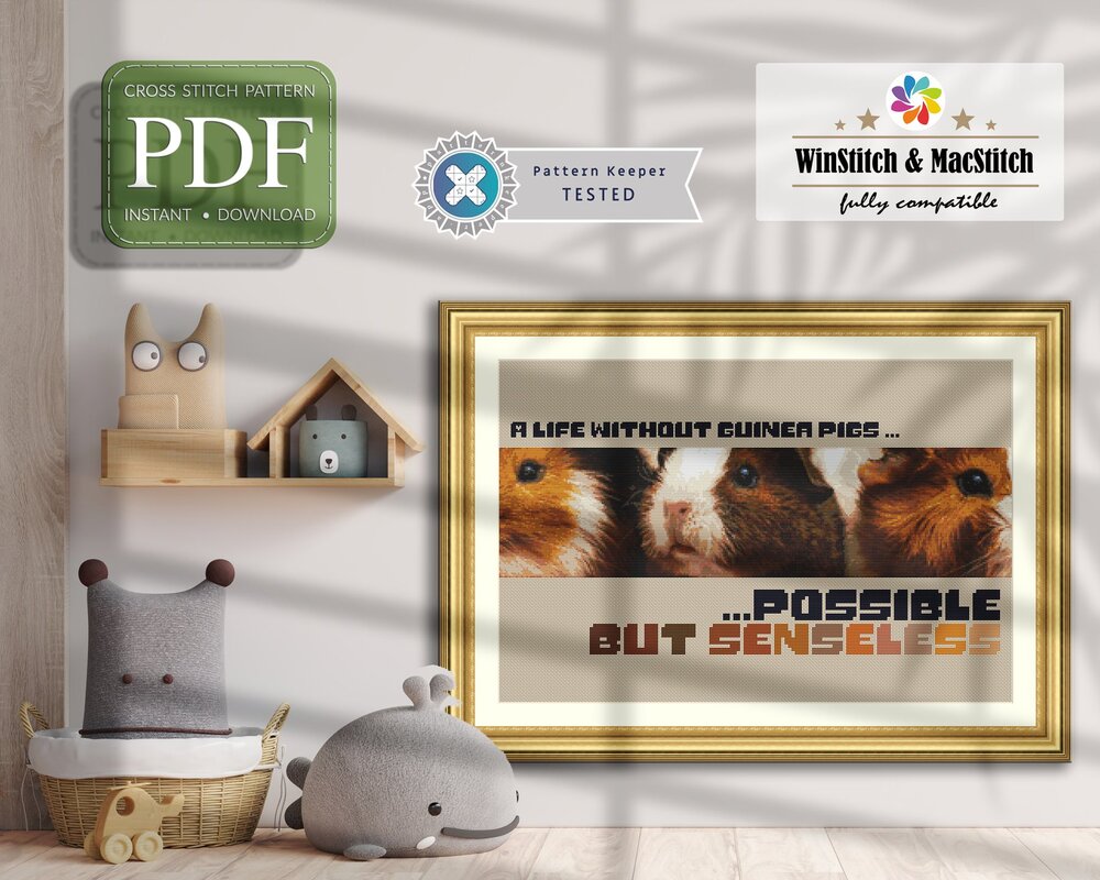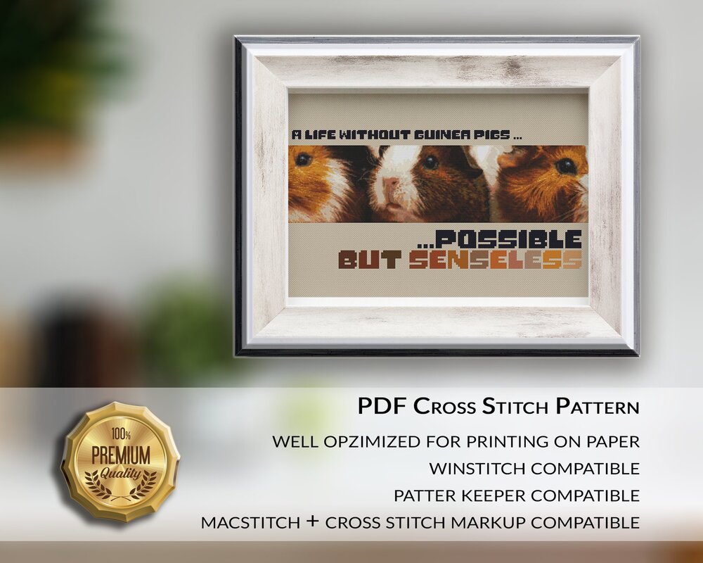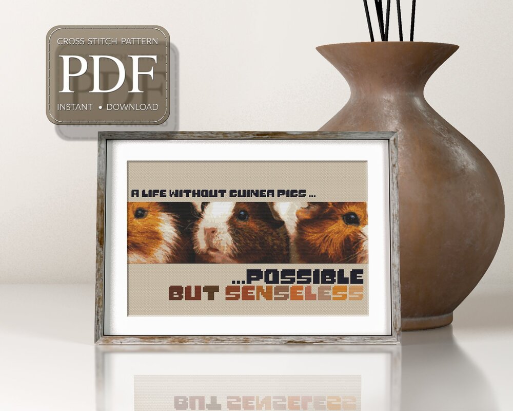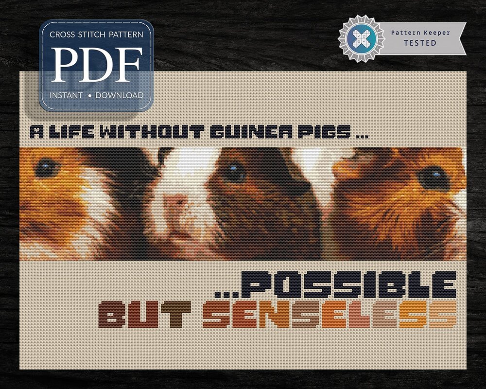 This cross stitch pattern with three little guinea pigs and the funny saying "A life without guinea pigs ... possible but senseless" is a joy for all big and small rodent friends!