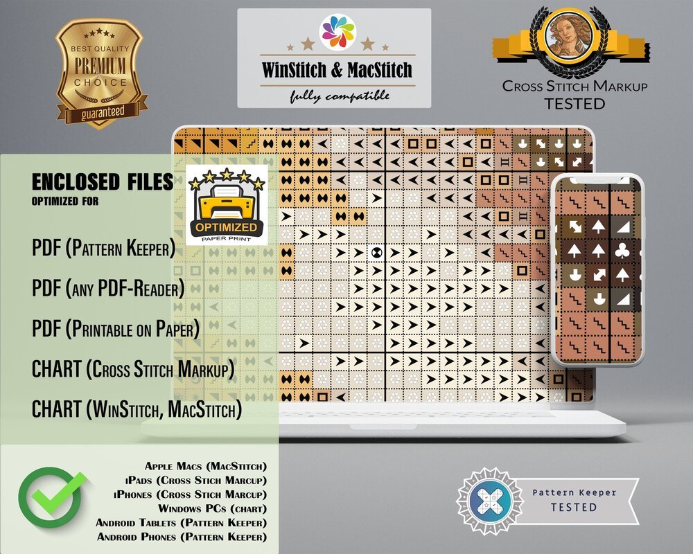 You will receive the cross stitch pattern as PDF files, available for instant download. The digital files are optimized for printing an paper or fore use on the screens of tablets, mobile phones or laptops (well tested for Pattern Keeper, WinStitch, etc.). You can buy these files right here and download them immediately.