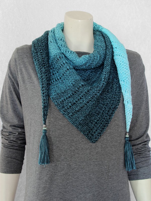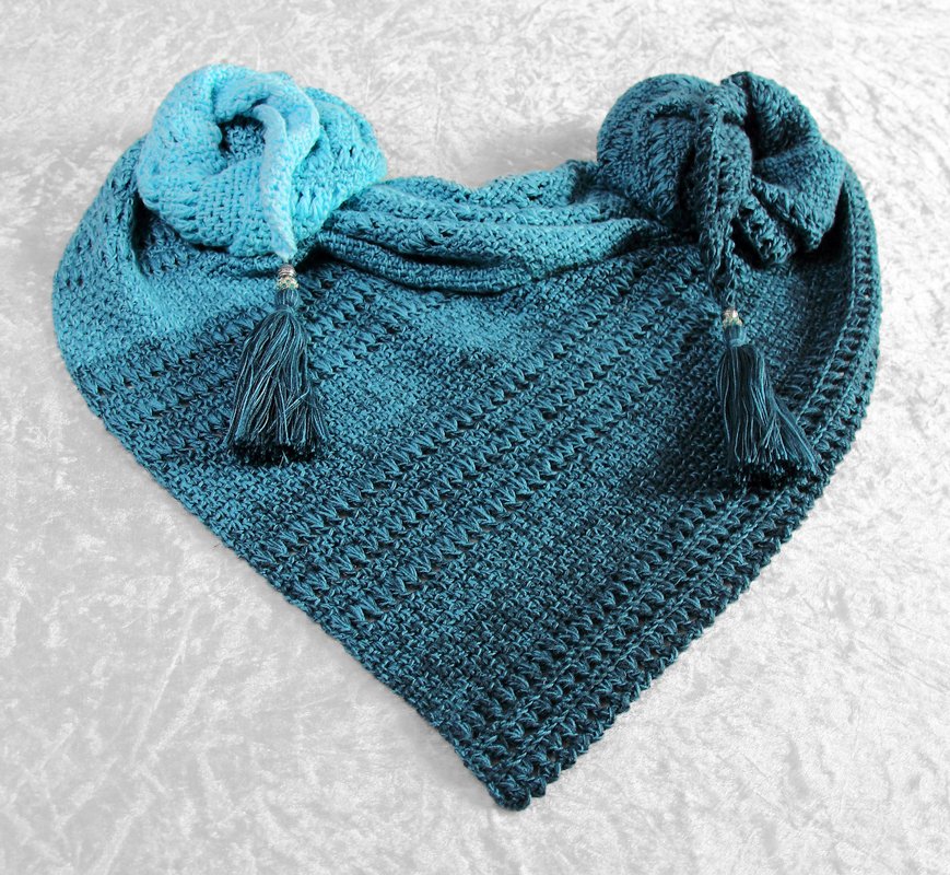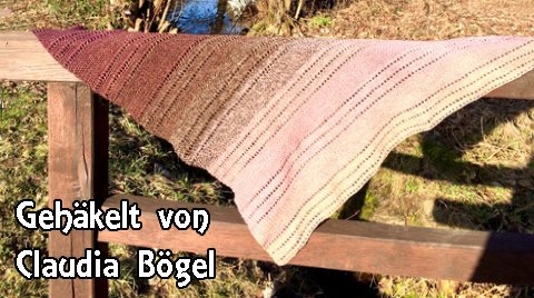 Das Tuch wird seitwärts gehäkelt. Durch gleichmäßige Zunahmen erhält es seine Form, die trotz des Aufbaus symmetrisch ist.