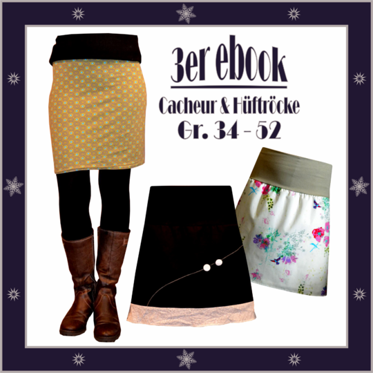 Mit diesen Anleitungen kannst die die drei abgebildeten Röcke ganz leicht nachnähen. Jeder Schritt ist verständlich beschrieben und bebildert. Für die zwei Röcke mit Stretchbund verwendest Du für den oberen Teil Jersey und für den Hauptteil Stoffe, die Du gern magst, wie Cord, Baumwolle, Walk, Jersey, Jeans ec. Durch den elasitschen Bund und den hüftigen Sitz sind sie auch wunderbar als Umstandsrock geeignet. Nichts zwickt oder drückt. Sie sind einfach nur bequem und können je nach Stoffauswahl elegant und festlich oder schlicht und gemütlich sein. Der Cacheur auf dem linken Bild ist aus zwei Jerseystoffen genäht ohne sichtbare Nähte zum Wenden. Er kann als einfacher Rock getragen werden oder über Hosen.