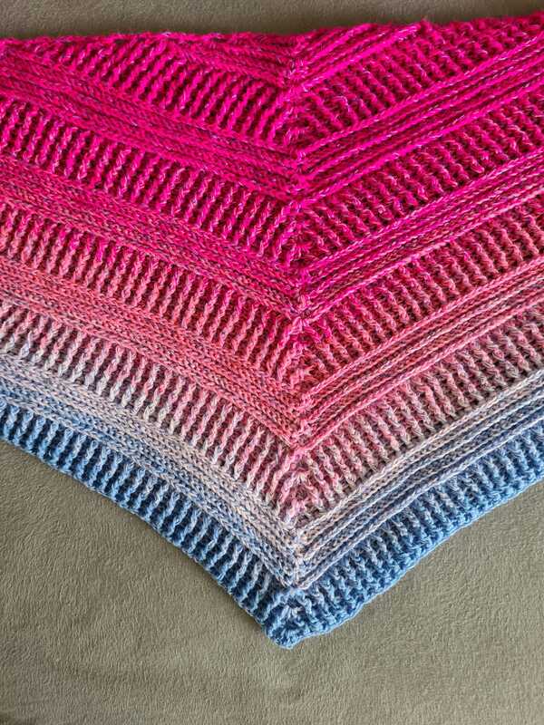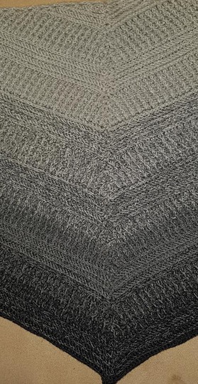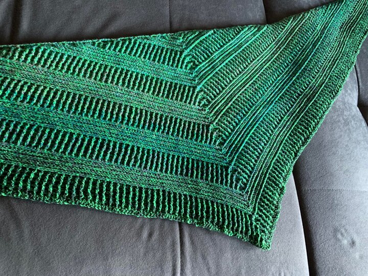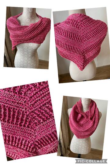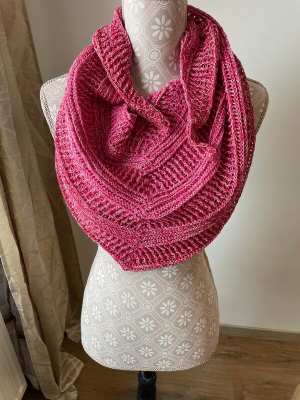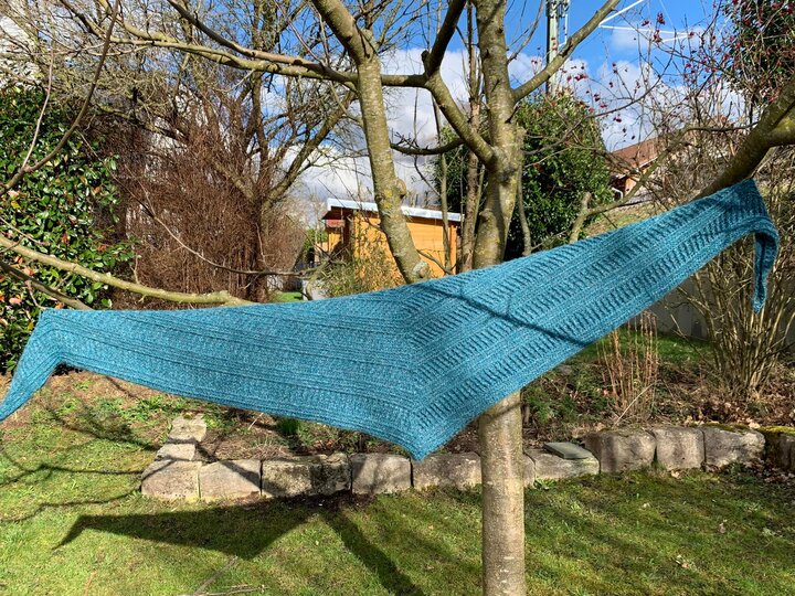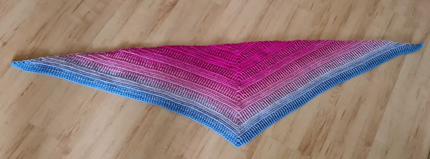 Ich habe 1000/4 aus dem kleinen Bobbelhaus verwendet (#99) + mit Nadelstärke 3,75 gehäkelt. Mein Tuch ist ca 204x42cm groß geworden.