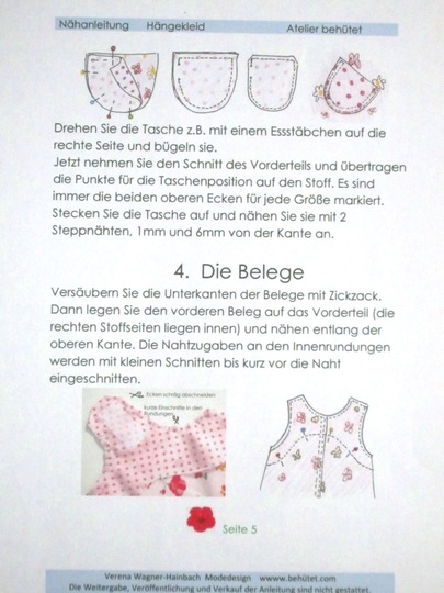 Süßes Modell mit aufgesetzten Taschen und Schulterverschluss. Sie können das Kleid wie auf den Bildern im Mustermix oder aus nur einem Stoff nähen. Der Schwierigkeitsgrad ist leicht bis mittel, es sind keine schwierigen Arbeiten dabei. Auch das Absteppen der Ziernähte ist mit Anleitung leicht zu schaffen. Sie können das Modell vereinfachen, indem Sie die Teilungsnähte vorn und hinten weglassen, sie sind nur Deko. Auch das ist in der Arbeitsbeschreibung erklärt.