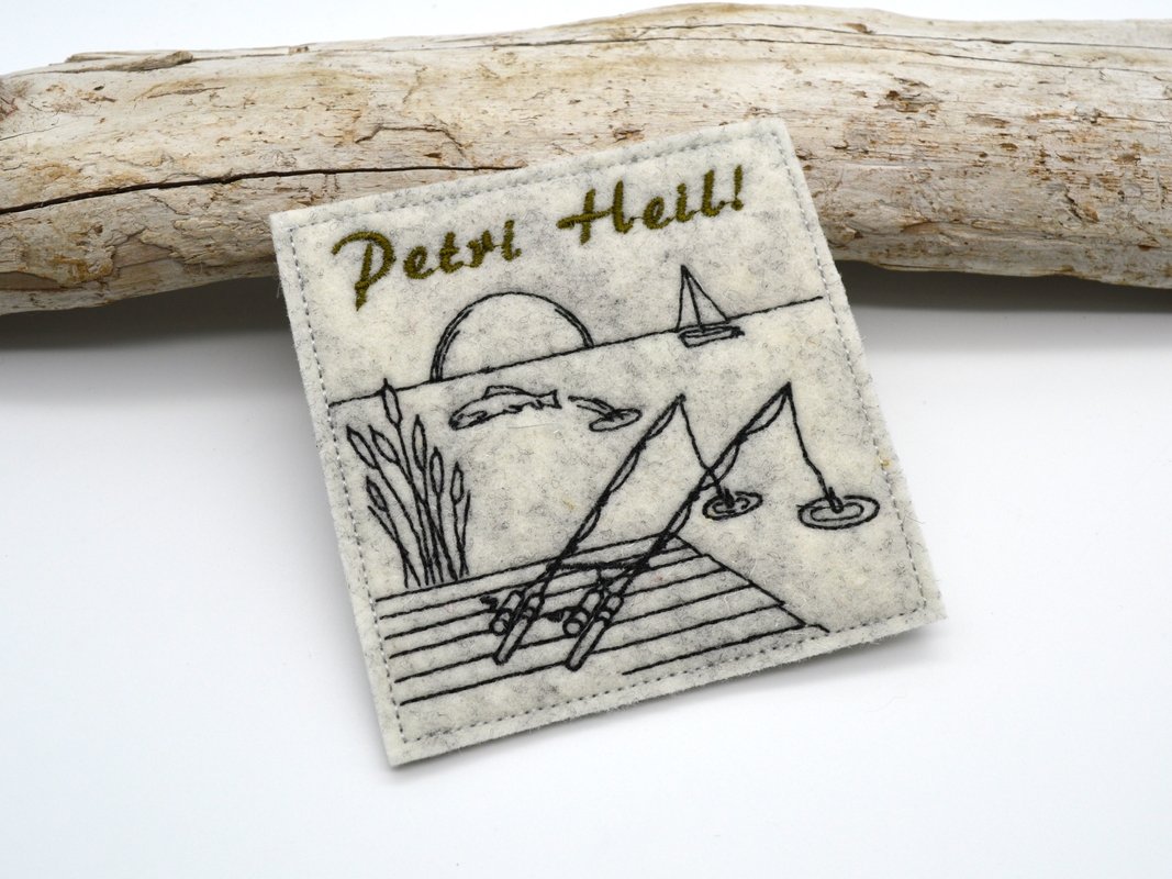 Die Untersetzer werden mit einem Angler-Motiv im Konturstich (Dreifachlaufstich) und eignen sich als "Bierfuizl" für einen Krug, Glas oder Flasche Bier.