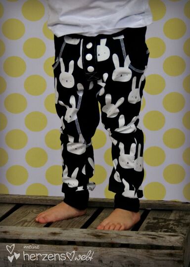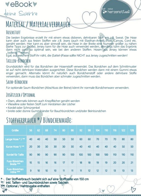 Das eBook beinhaltet in Schnittmuster für die Hose mit den Größen 56-128. Für die Größen 134-170 gibt es ein separates eBook.