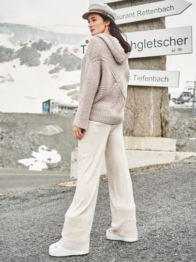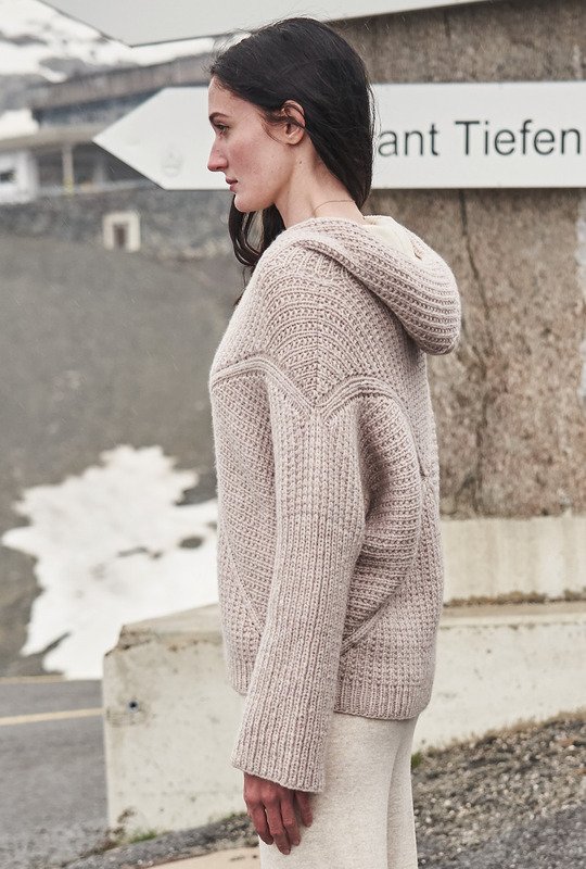 Bei diesem coolen Pulli mit Kapuze werden Vorder- und Rückenteil von der Mitte aus in Runden zu Quadraten gestrickt – ein raffinierter Dreh, der für eine ganz neue Optik sorgt und durch einfache Rippenstrukturen akzentuiert wird. Der Clou: Sowohl für die Kapuze, als auch für die Ärmel werden an den Rändern des Quadrates vom Rücken- und vom Vorderteil die Maschen stillgelegt. So kann die Kapuze direkt angestrickt werden und auch die Ärmel werden von oben nach unten direkt an die Körperteile angestrickt. So hält sich dann auch der Aufwand für die Fertigstellung ganz praktisch in Grenzen. Es wird nur noch die obere Kapuzennaht geschlossen, ebenso die Nähte der Seiten und Ärmel. Dann noch die stillgelegten Maschen der unteren Ränder auf die Nadeln nehmen, das Rippenbündchen in Runden stricken – und fertig ist der Hoodie