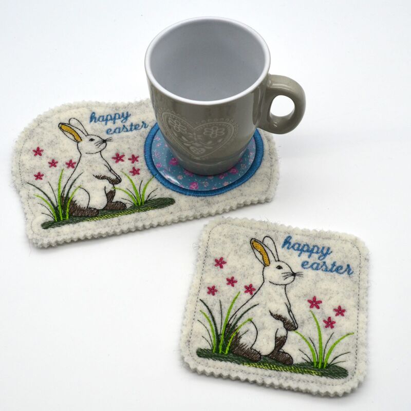 Die Untersetzer werden mit dem kleinen Hasen und einer kreisrunden Applikation bestickt und eignen sich als Untersetzer für Kaffeetasse, Gläser, Teetassen, aber auch für ein Kerzenglas oder kleine Blumenvase.