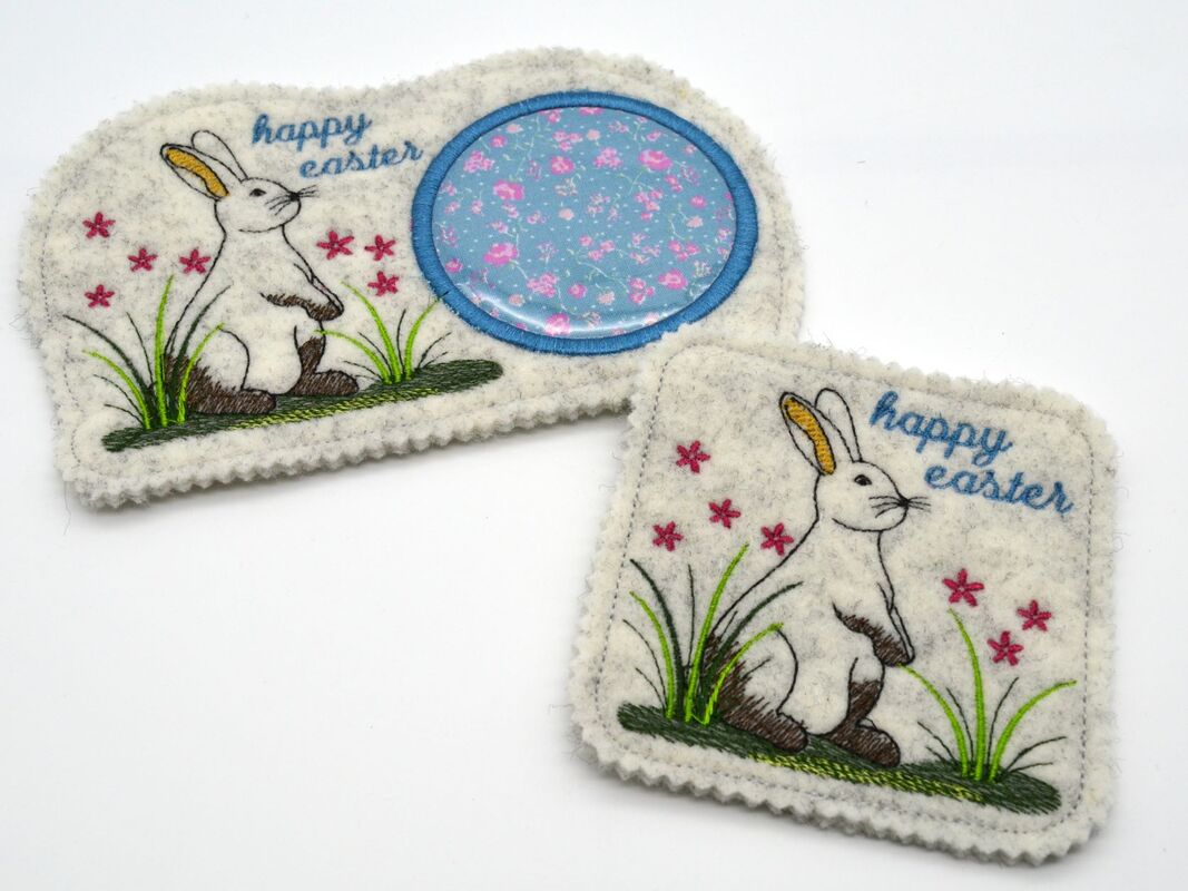 Stickdatei für Untersetzer in der Osterzeit. Sie sind eine wunderbare Ergänzung zu dem Hasen aus dem Überraschungskorb voller Stickdateien.