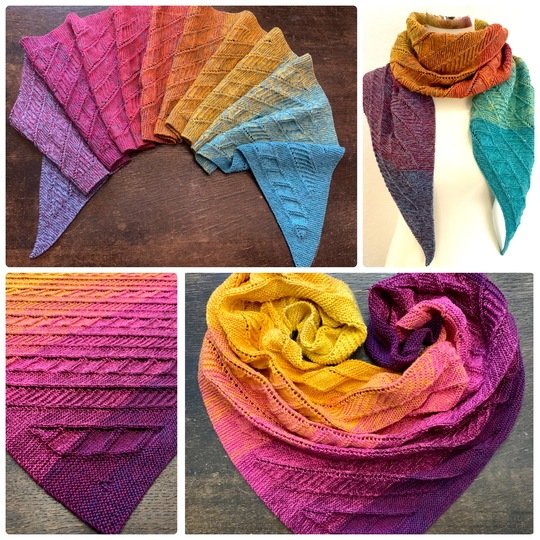 Die Anleitung ist ausführlich beschrieben mit Musterbeschreibung, schriftlicher Anleitung und verschiedenen Strickschriften. Alternativ kannst du auch mit dieser Anleitung aus den beschriebenen Mustern ein leicht asymmetrisches Dreieckstuch stricken.