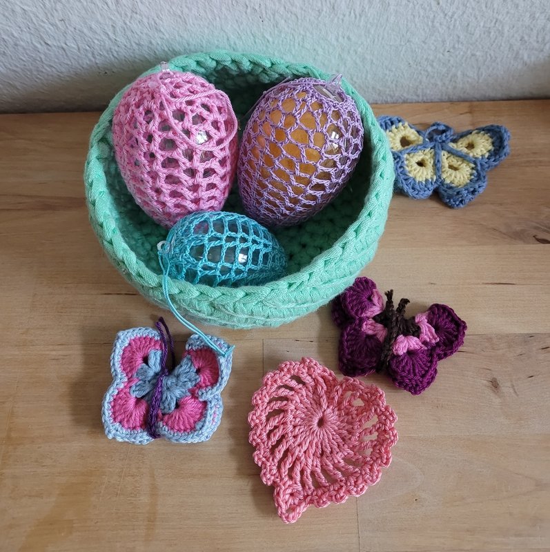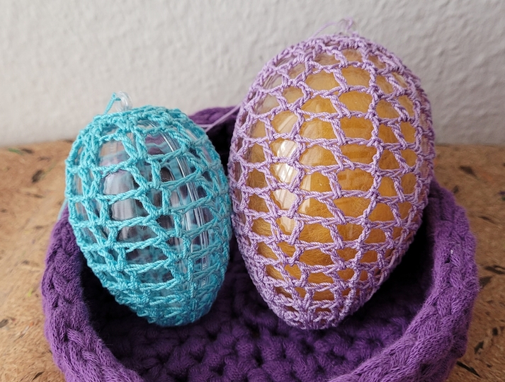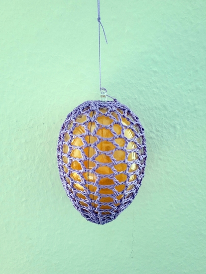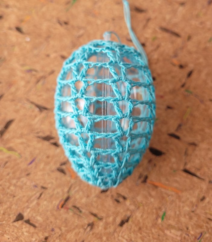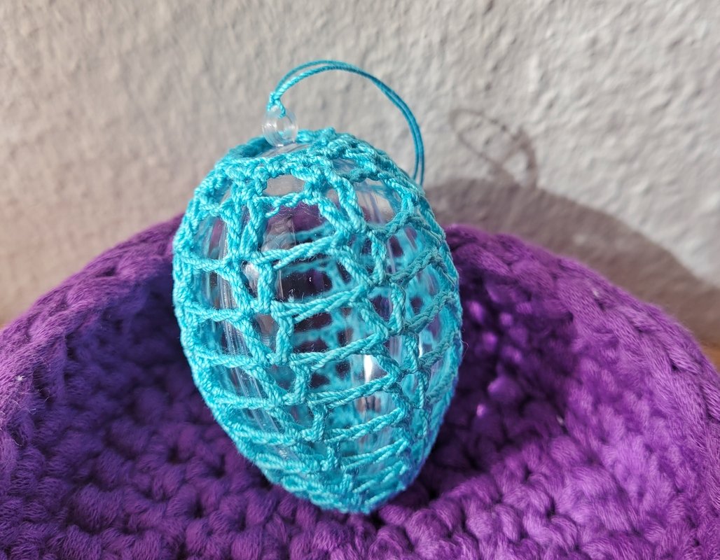 Um durchsichtige Acryl Eier herum, mit dünnem Garn, das sonst für die Filethäkelei benutzt wird.