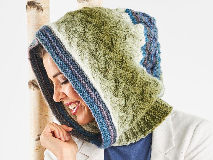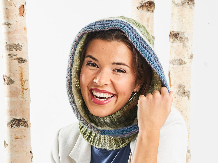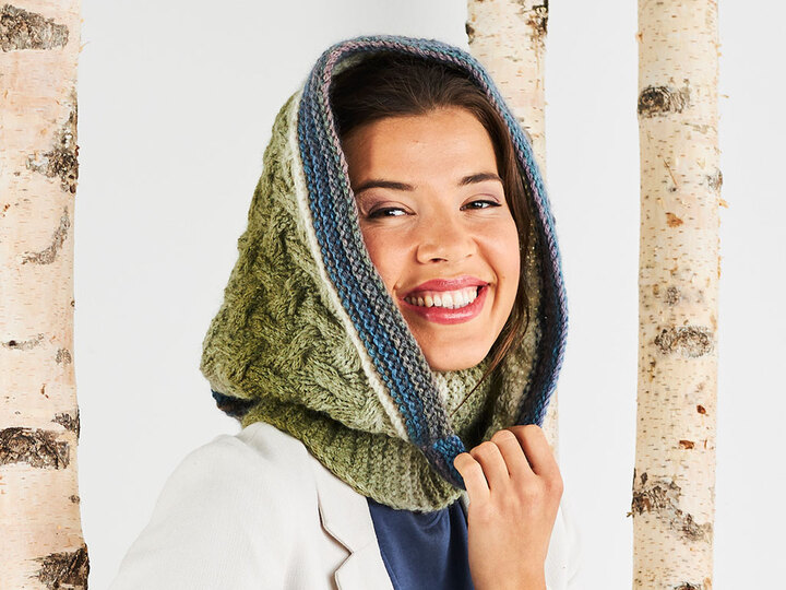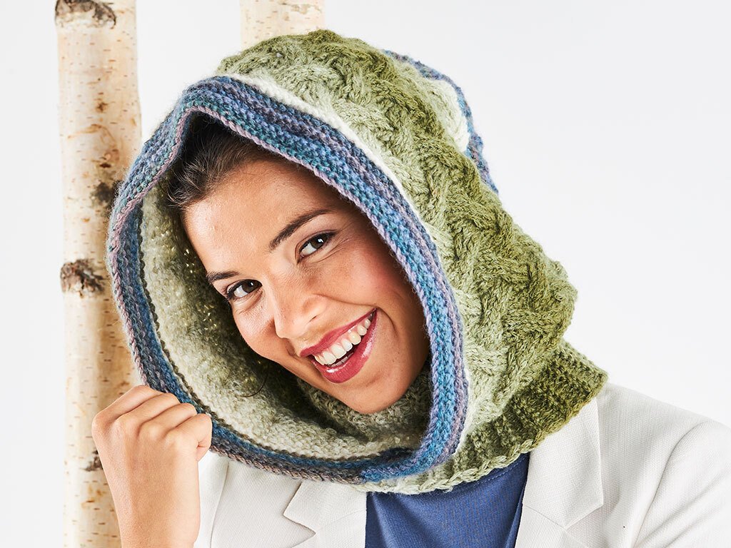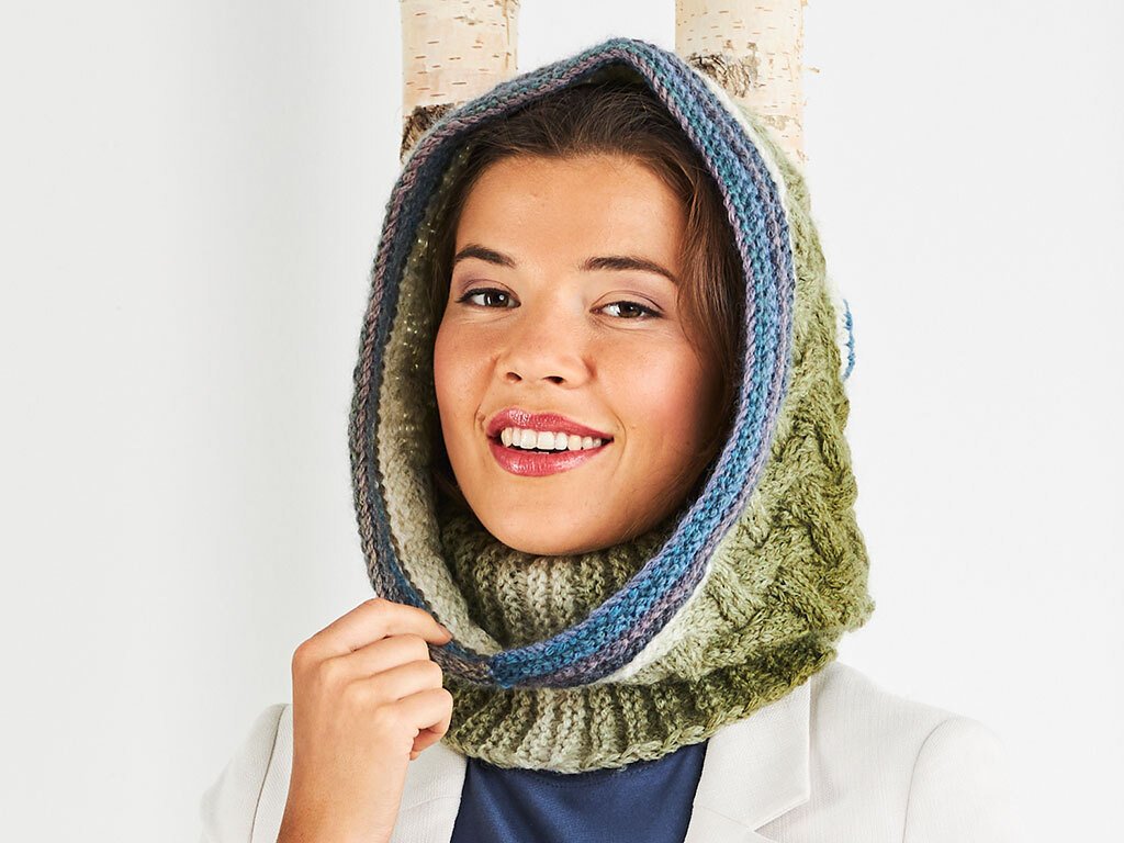 Diese super schöne Kapuze mit einem kleinen integriertem Loop ist wahrlich ein Hingucker. Diese schönen aufeinander abgestimmten Farben kombiniert mit einem schönen Flechtmuster sind eine Kombination, die einfach zusammen gehört. Ich müsst euch noch nicht einmal um den Verlauf kümmern, denn dieses Garn macht es euch besonders leicht.