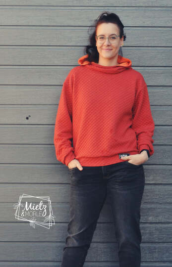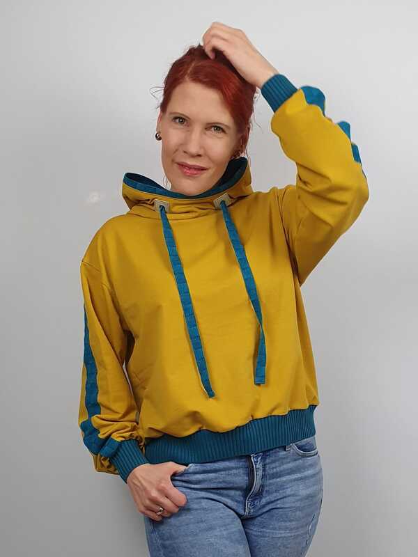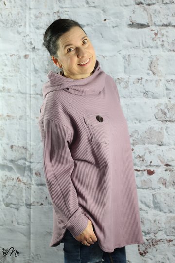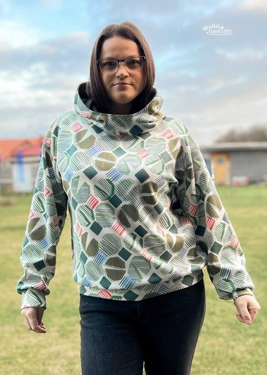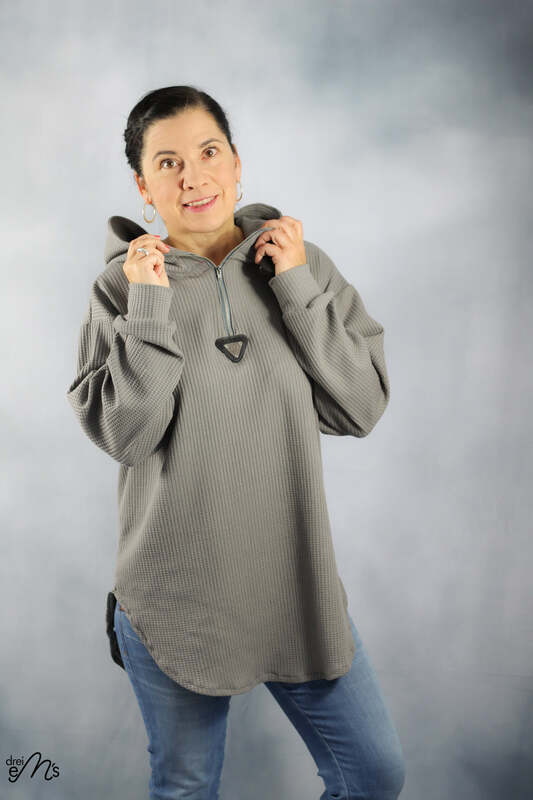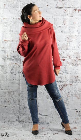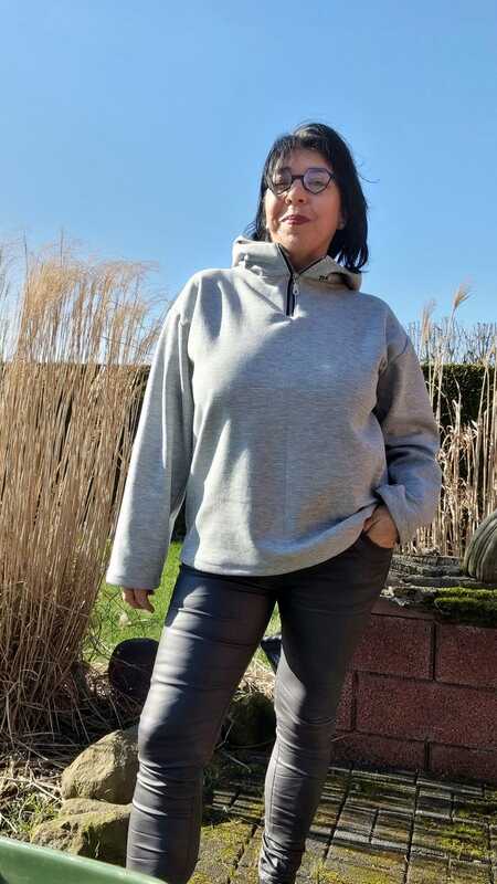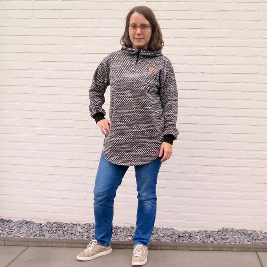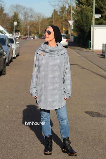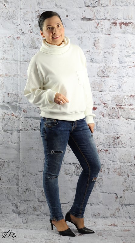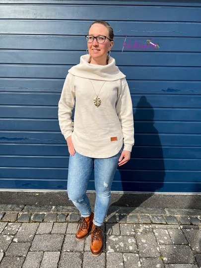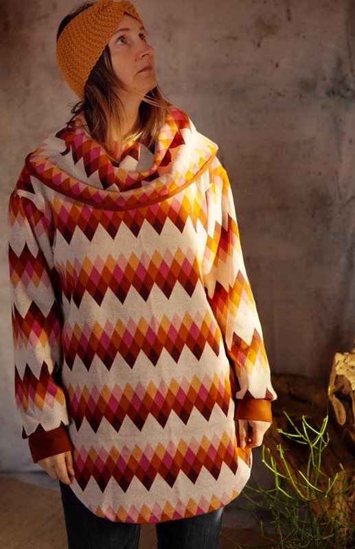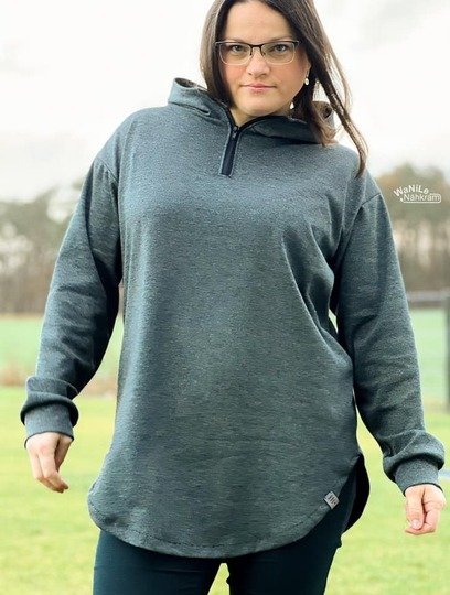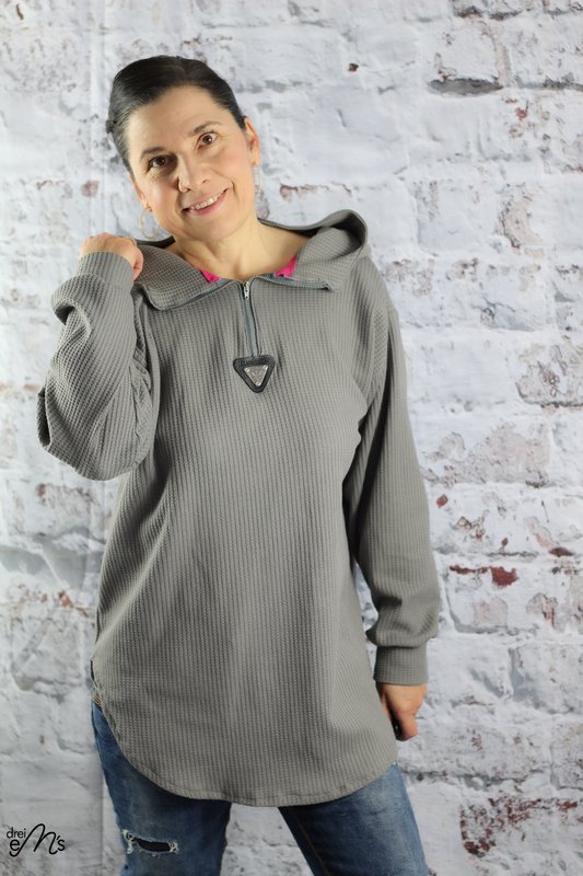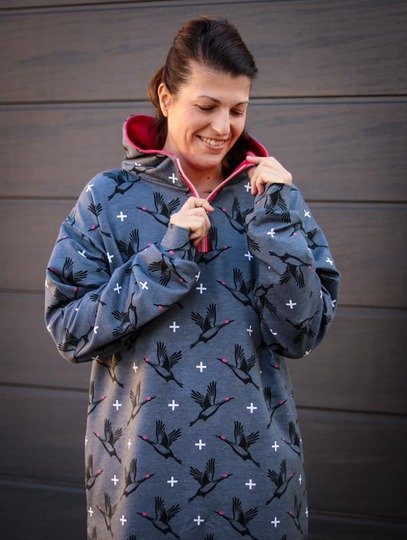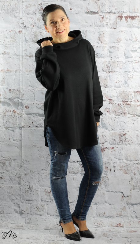 GINOSA bekommst du in den Größen 32-57. Der Schnitt besticht durch seine abgerundeten Saum und die vielen Varianten. Du kannst dich zwischen Astronautenkapuze, Kapuze mit Reißverschluss, XXL-Kragen (eng-wie Rollkragen) XXL Kragen weit entscheiden. Ebenso stehen dir 3 Längen zur Verfügung und wenn du es lieber kurz magst, ist natürlich auch eine Sweater-Länge enthalten.