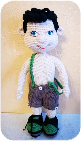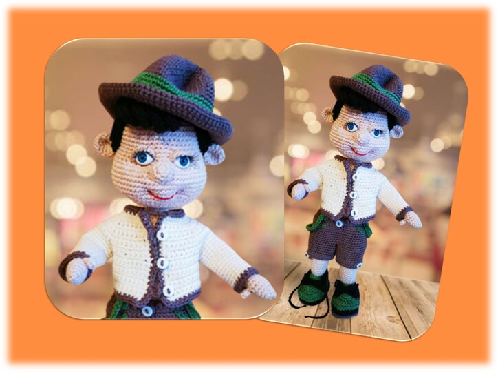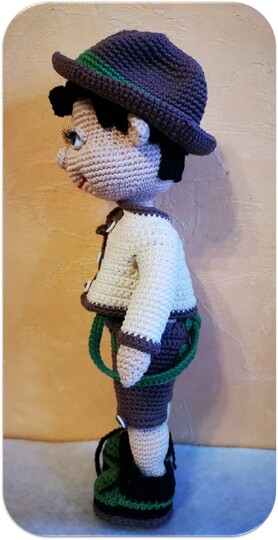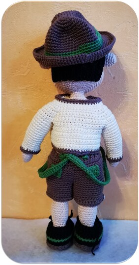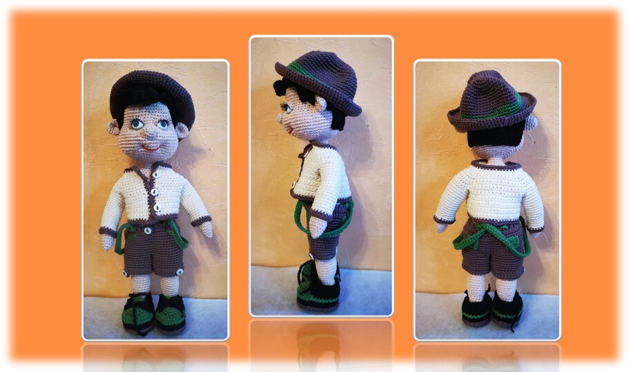 Franz´l hat nach dieser Anleitung eine Höhe von ca. 32cm von Fuß bis zum oberen Rand der Mütze und ca. 23cm mit ausgespreizten Armen.