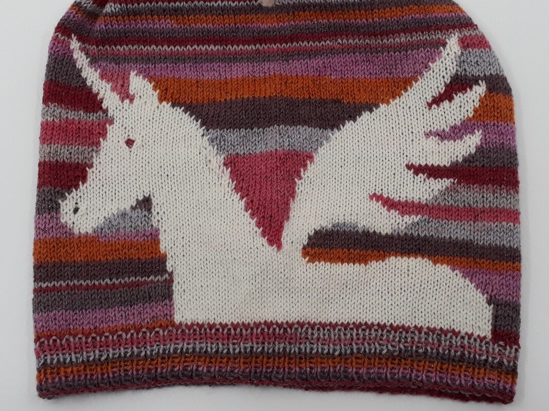 Du kannst das Einhorn einstricken oder nachträglich aufsticken. Besonders schön wird es, wenn Du es einstrickst. Die Mühe lohnt sich!