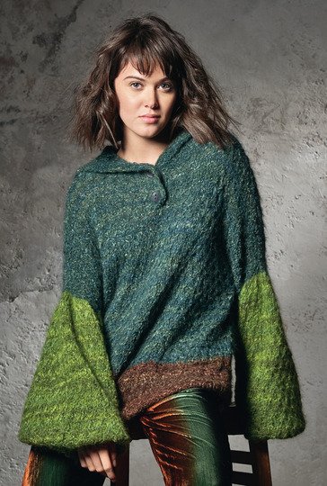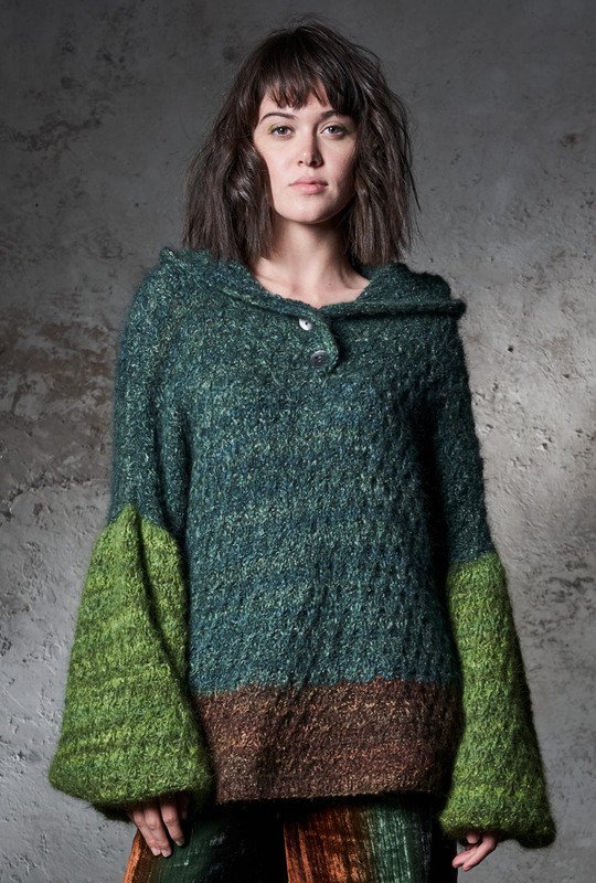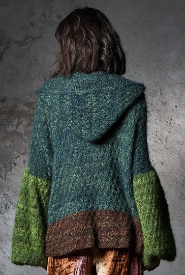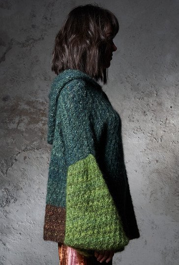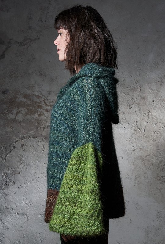 Das anschmiegsame Flauschgarn mit Baby-Alpaka und schöner Bouclé-Struktur ist die Basis für diesen schönen Hoodie, der in drei harmonische Farbabschnitte unterteilt ist. Der Clou sind die modischen, fließenden und überweiten Ärmel. Durch die stark überschnittene Schulter wird dieses Designelement zusätzlich gekonnt in den Fokus gerückt. Los geht es mit dem Rückenteil: Erst das Rippenbündchen, dann allover im Strukturmuster. Das Vorderteil wird ebenso gestrickt, nur das hier zusätzlich noch der sportive Poloausschnitt gearbeitet wird. Danach werden die Schulternähte geschlossen und die Ärmel direkt von oben nach unten angestrickt. Für die Kapuze werden die zuvor stillgelegten Maschen des Rücken- und Vorderteils wieder auf die Nadeln genommen und ebenso im Strukturmuster gearbeitet, zum Schluss wird die Naht gleich durch zusammenstricken der der übrigen Maschen geschlossen – hier muss nichts mehr vernäht werden. Die Verschlussränder des Polo-Kragens, die Ärmel und die Kapuze erhalten dann noch einen schönen, sauberen I-Cord Rand, die restlichen Nähte werden geschlossen und die Knöpfe angenäht. Wer den Ärmelabschluss besonders schön anliegend haben möchte, zieht sich noch das Hutgummi innen in den I-Cord Rand der Ärmel.