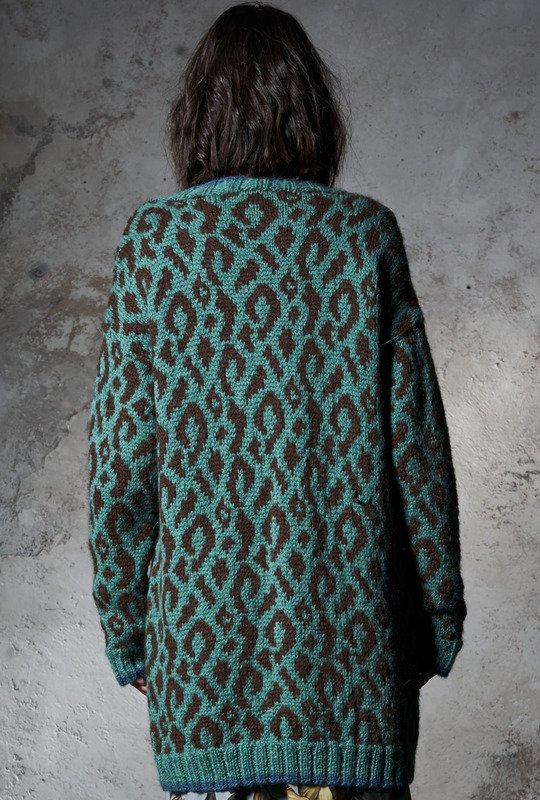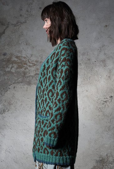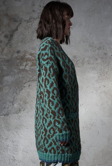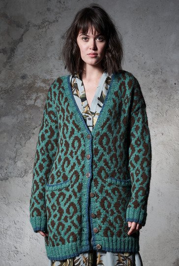 Gestrickt wird unser Cardigan in Leo-Optik in Einzelteilen und bis auf die Rippenblenden allover im Jacquardmuster. Begonnen wird mit dem Rückenteil, dann mit den Taschenbeuteln – den die werden bei den Vorderteilen direkt mit eingestrickt. Sind auch die Ärmel geschafft, geht es an die Ausarbeitung: Die Taschen erhalten ihre Blende, die Taschenbeutel werden innen angenäht. Die Schulternähte werden geschlossen, die Maschen aus den Ausschnitträndern und Kanten aufgefasst und auch hier die Blenden inklusive Knopflöcher gestrickt. Dann noch die restlichen Nähte schließen und die Knöpfe anbringen.