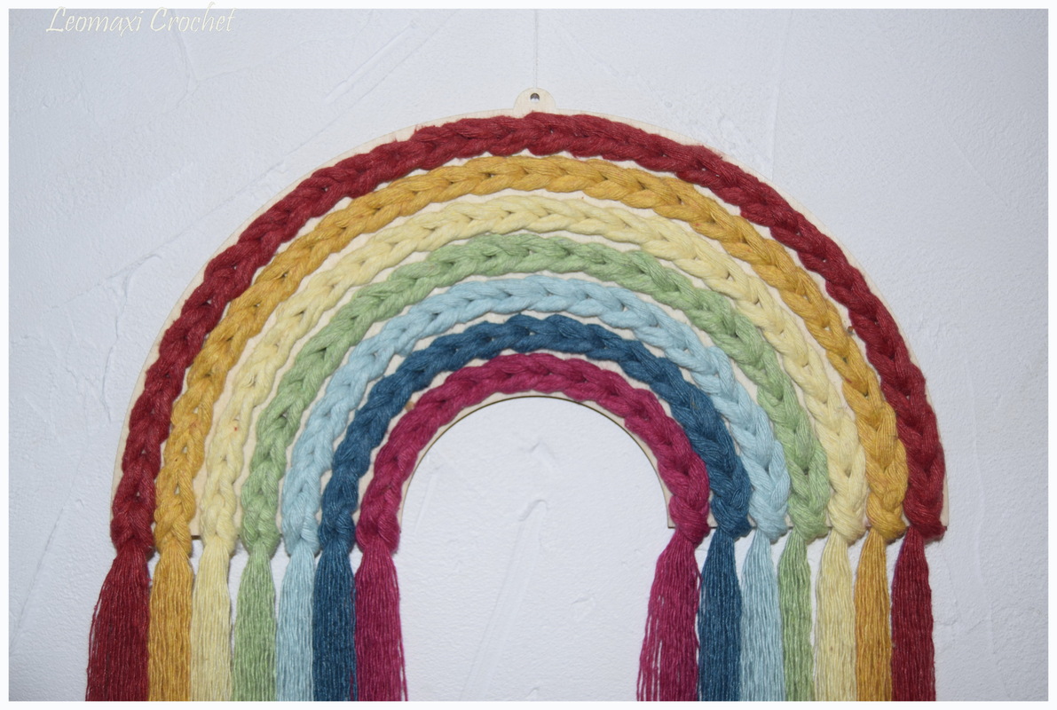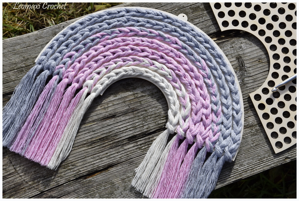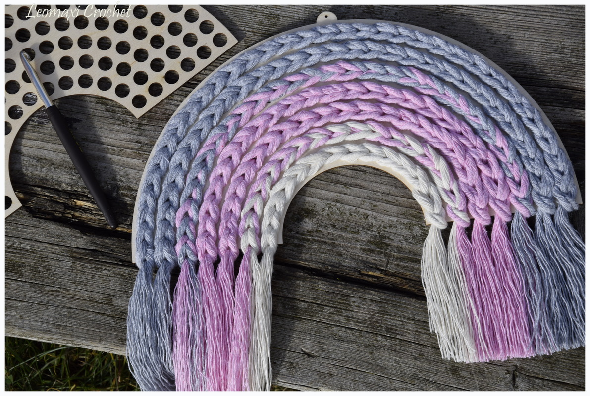Die Grundlage für den Regenbogen ist eine halbrunde Sperrholzplatte, die mit Löchern versehen ist. In diese Löcher werden die Regenbogenstreifen hineingehäkelt. Hier kannst du deine Lieblingsfarben auswählen und kombinieren. Als Material habe ich hier mit Makramee- Garn gearbeitet. Das Spresso von Hoooked hat eine große bunte Farbpalette und seit ein paar Wochen gibt es die Knäule auch mit 200g in klein, so kannst du mehrere verschiedene Farben kaufen und hast nicht so viel Material je Farbe übrig.