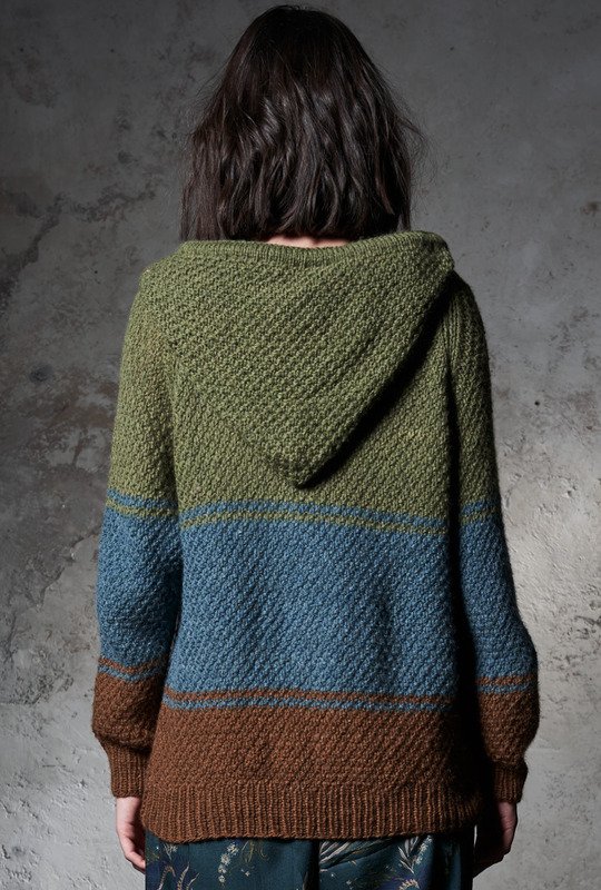 Wir feiern die Hoodie-Saison das ganze Jahr! Denn kaum ein anderes Kleidungsstück kann sowohl lässig, leger oder auch sportiv und modern interpretiert werden, ist so unkompliziert und vielseitig. Dieser lässige Kapuzen-Pulli punktet mit seinem plastischen Perlmuster und dem geschickten Zusammenspiel von Cognac, Petrol und Oliv. Gestrickt wird in Einzelteilen: erst das Rippenbündchen, dann weiter im Perlmuster. Mit Nadelstärke 6 und dem angenehm über die Nadeln gleitendem Garn aus Schurwolle und Kamel geht es schnell voran. Das große Perlmuster bietet dabei Abwechslung, ist aber unkompliziert zu stricken. Sind Vorderteil, Rückenteil, Ärmel und Kapuze dann geschafft, geht es auch schon an die Ausarbeitung. Die Raglannähte werden geschlossen, die Kapuze bekommt ihren Tunnelzug und wird an den Halsausschnitt genäht, dann werden die restlichen Nähte geschlossen. Und schon können wir ihn anziehen – ganz lässig im Street-Style, als gekonnten Bruch zum femininen Flatterrock oder ganz schlicht zur Jeans.