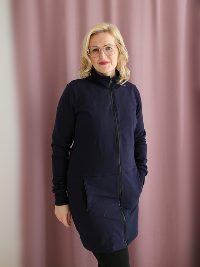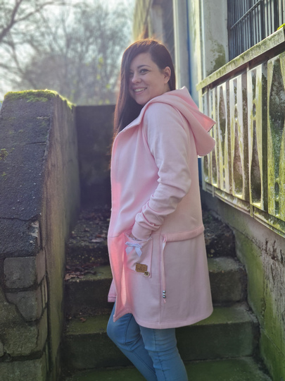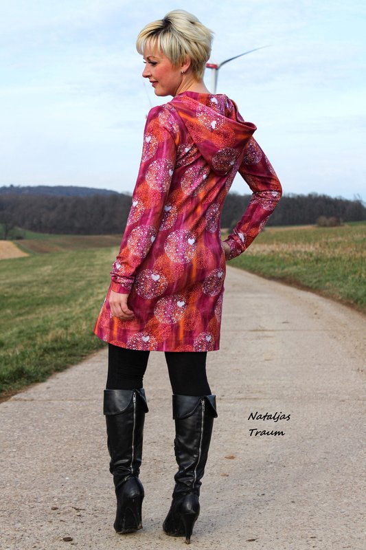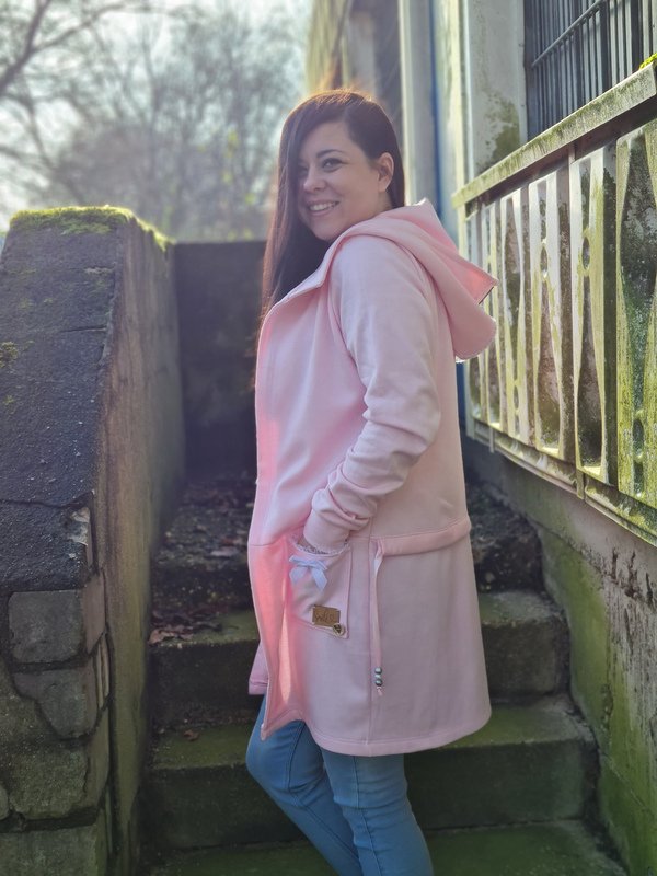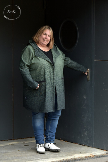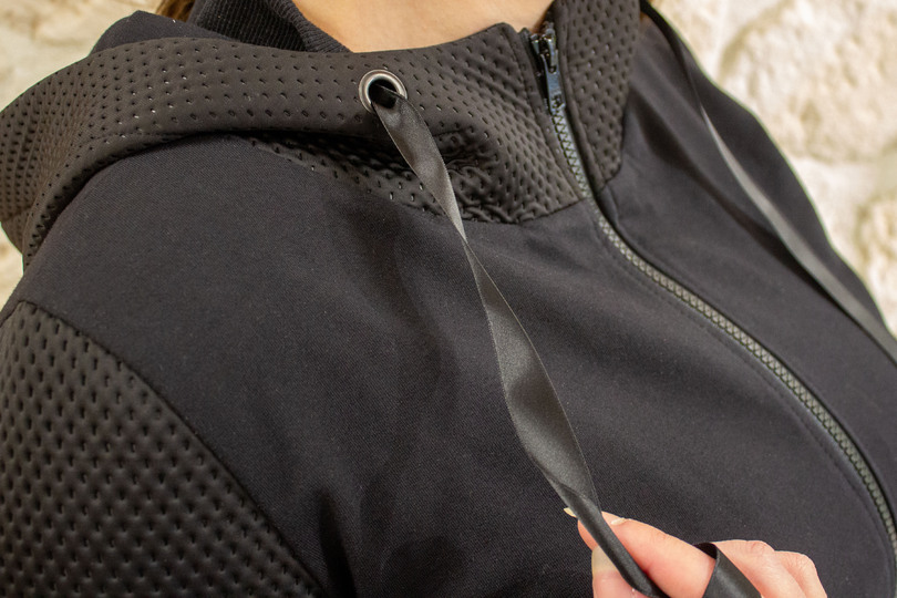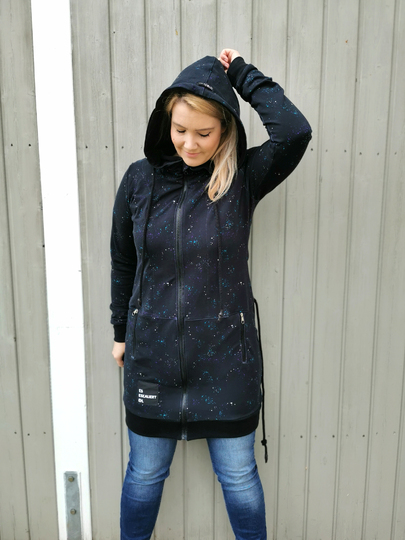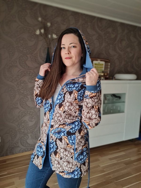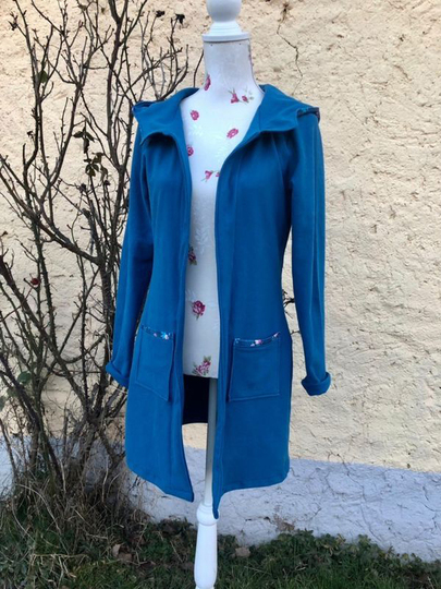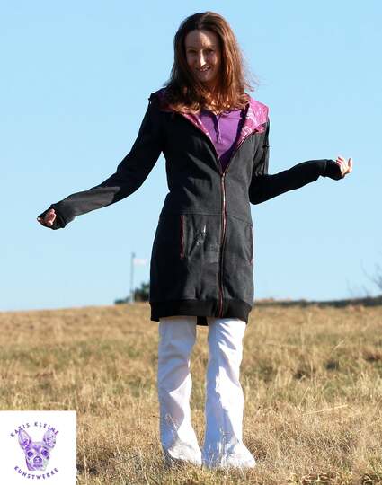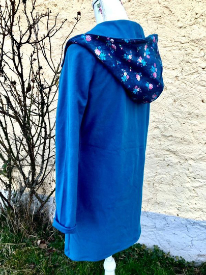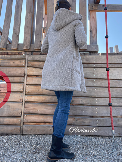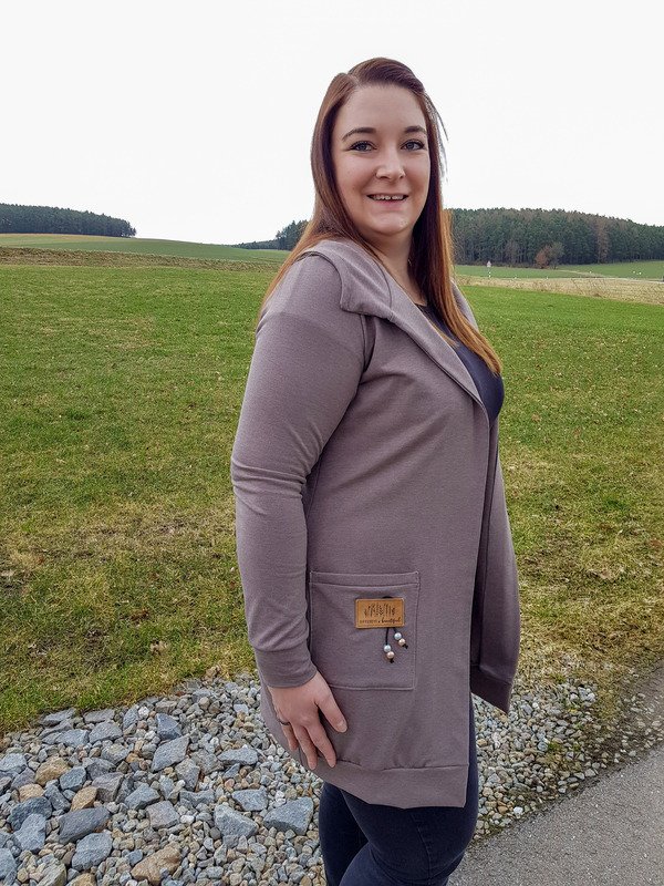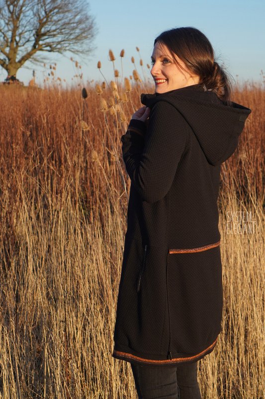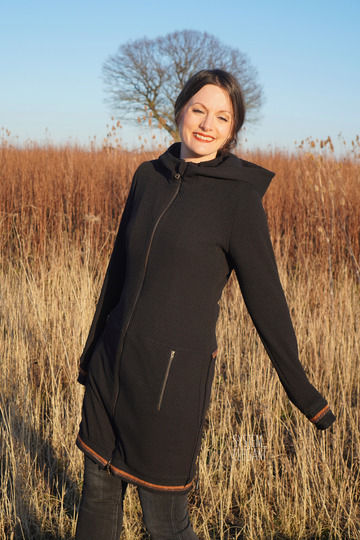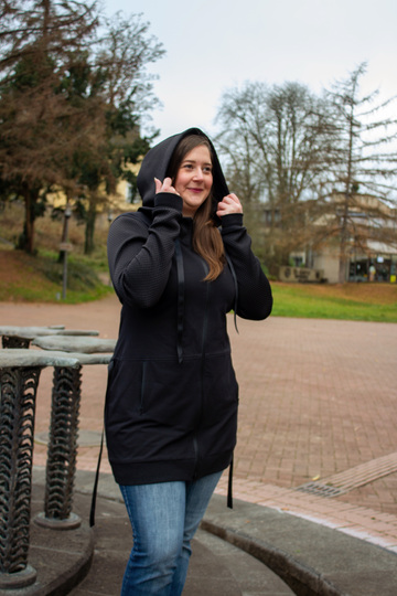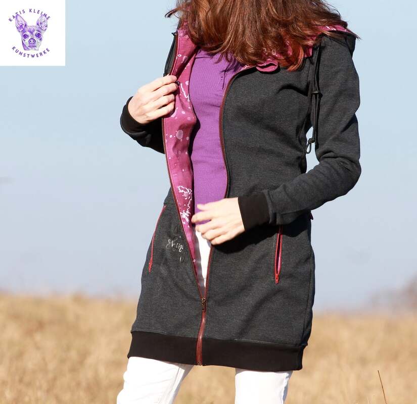 Zusammengefasst: Dieser Schnitt bietet dir eine Version ohne Teilung und Verschluss, eine Version mit Teilung und Reißverschluss, 2 Taschen und 2 Kapuzen (mit und ohne Mittelstreifen), sowie einen Stehkragen aus Bündchenware.